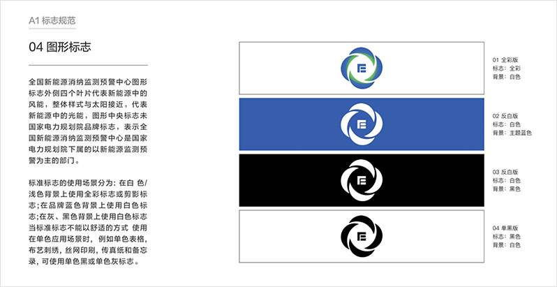 制約新能源消納的關(guān)鍵因素,為新能源的優(yōu)化布局和行業(yè)政策制定提供參考,促進(jìn)我國新能源高質(zhì)量發(fā)展。 藍(lán)藍(lán)設(shè)計對全國新能源消納監(jiān)測預(yù)警中心的工作范圍做了調(diào)查研究,首先理解業(yè)務(wù)和核心競爭力,之后調(diào)查了行業(yè)相關(guān)品牌標(biāo)志設(shè)計,聽取了大家的期望,之后設(shè)計出多版logo供選擇。標(biāo)志設(shè)計確定后進(jìn)行了VI和宣傳冊的設(shè)計。