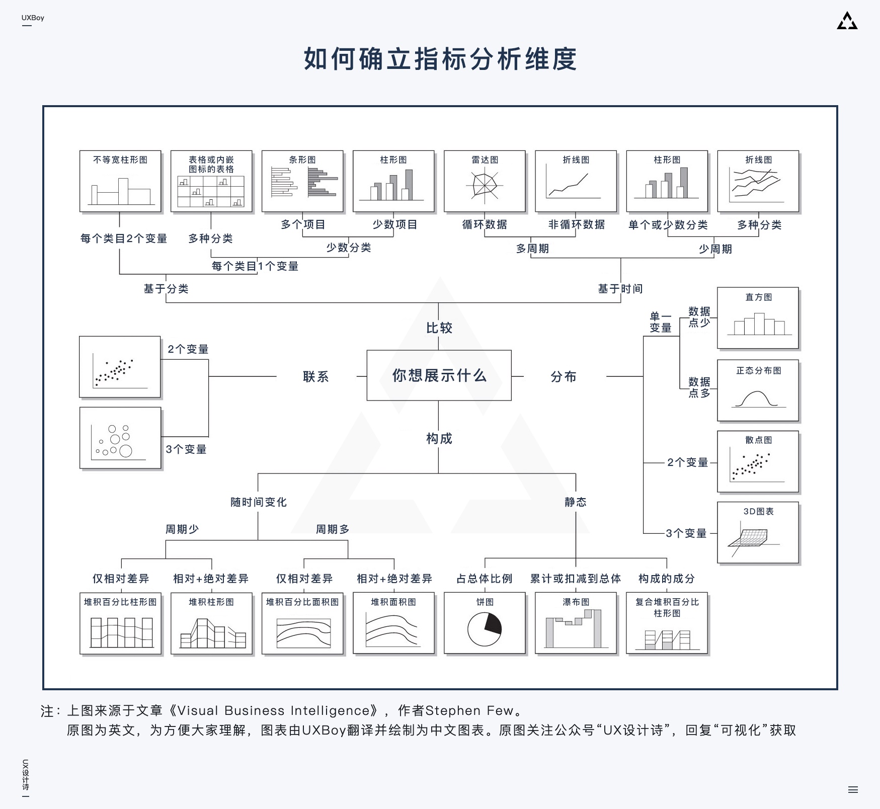 上圖向大家展示了數(shù)據(jù)分析常用的4個維度,我們在選定指標后,就需要跟項目組其他小伙伴討論:我們的各個指標主要想給大家展示什么,更進一步的講,是我們想通過可視化表達什么樣的規(guī)律和信息。而上圖,可以引導我們從「聯(lián)系、分布、比較、構成」四個維度更有邏輯的思考這個問題。