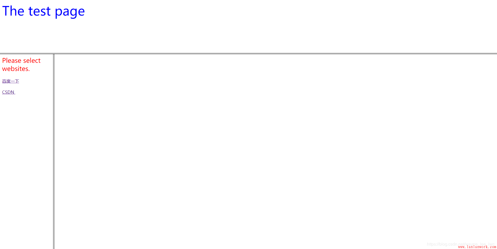 <html> <head></head> <frameset rows="500,*" border="3" noresize="noresize"> </frame> </html>看上面的代碼,用frameset替換掉body不難理解,畢竟我們約定做框架的網(wǎng)頁不具有實體內(nèi)容 接著,這里提到了框架標簽的三個屬性,分別為: rows/cols 框架的分行或分列 border 分隔框的寬度 noresize 大小是否可調(diào) 現(xiàn)在來分別解釋一下 第一個,rows 或cols 屬性,代表了框架的分行或分列的情況,在引號內(nèi)書寫該屬性的值的時候,不需要指明分成幾欄,只需要指明每一欄占據(jù)的寬度或高度(單位為像素)并使用逗號隔開。瀏覽器在解析的時候會計算到底分成了幾欄。另外,不指定寬度而使其占據(jù)剩余位置時,可以使用通配符 “ * ”。 第二個,border 屬性,代表了分隔框的寬度,這是屬性的數(shù)值單位是像素。所以如果你不想加入邊框,則可以將它設(shè)置為零。 第三個,noresize 屬性,表示我們的框架的大小是否可調(diào),frameset標簽?zāi)J為大小可調(diào),當用戶鼠標移動到邊框上時,他可以拖拽改變大小。所以如果不想讓用戶隨意改變框架大小,那么可以選擇使用這個屬性 (當然,也可以選擇把邊框的寬度設(shè)為零,讓他找不到)。 這個屬性的值同屬性名稱一樣。 最后還需要說明的是:框架集標簽是可以進行嵌套的,也就是說,在已經(jīng)分出來的框架中,我們可以借著分欄。 在框架內(nèi)鑲嵌網(wǎng)頁 剛剛我們使用 frameset 標簽將網(wǎng)頁變成框架并劃分成了若干區(qū)域,每一個區(qū)域都是一個單獨的可顯示頁面的子網(wǎng)頁(筆者起的名)。現(xiàn)在,我們需要在這些區(qū)域內(nèi)為它鑲嵌上一個網(wǎng)頁,這需要用到frame這個單標簽在框架下添加網(wǎng)頁,它的寫法如下: <frame src="...." name="...." /> 1 這里可以看到 frame 標簽的兩個屬性; src 和 name 。它們分別代表著添置連接(這是一個超鏈接,網(wǎng)頁,HTML文件,圖片等都是可以的。有關(guān)超鏈接的信息,可參照上一篇學(xué)習(xí)總結(jié)或者問問度娘 ),以及框架名稱。 框架的命名,很主要的一個原因在于可以重復(fù)利用一個框架,即在其他標簽使用時,可以在某個框架上顯示相應(yīng)內(nèi)容。還記得上一篇中,我們提到的鏈接標簽 target 屬性中的 “某框架名稱” 這個值嗎?在為框架命名后,就可以使用上述的 target 用法,將打開的網(wǎng)頁放在某個框架中了。 綜上,舉個例子: 先來創(chuàng)造一個帶有嵌套的框架<!--frame--> <html> <head></head> <frameset rows="200,*" border="5" noresize="noresize"> <frame src="title.html" name="title" /> <frameset cols="200,*"> <frame src="selection_bar.html" /> <frame name="output_page" /> </frameset> </frameset> </html><!--title--> <html> <head></head> <body> <font size="7" color="blue"> The test page </font> </body> </html>