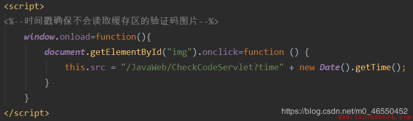 在這里,因為點擊驗證碼更換操作需要用到j(luò)s,所以我百度得到了上圖這樣一串代碼。其中時間戳的作用是通過改變每次請求的時間參數(shù)來獲得刷新效果,即改變url中的響應(yīng)頭信息。