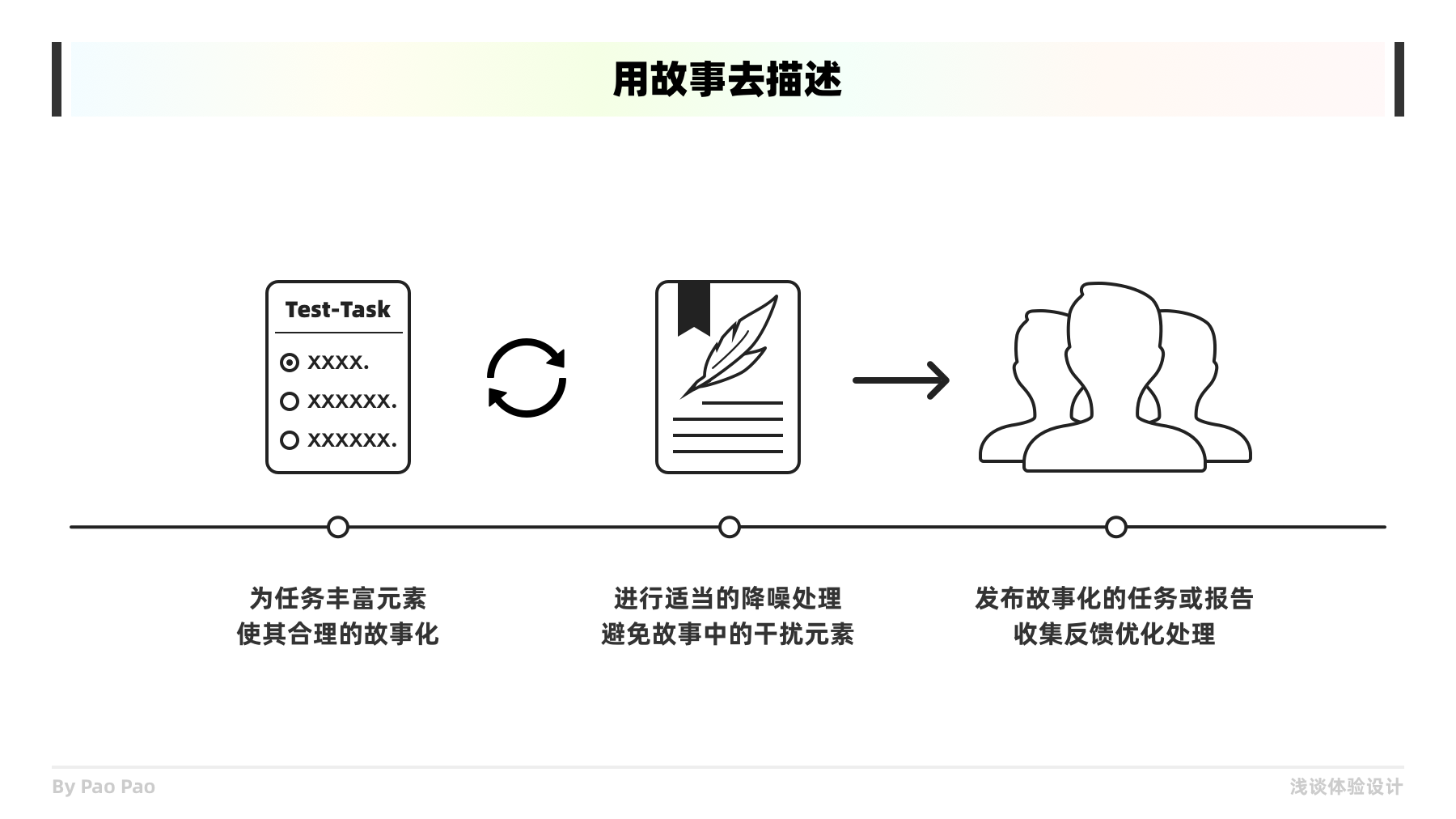 故事的元素通常會更豐富更有趣味,用故事敘事更能提升用戶的興趣和關(guān)注,這能便于構(gòu)建共情。因此當你發(fā)布測試任務或者撰寫研究報告時,都可以加入背景故事或用故事敘事,便于對象更容易理解和共情,你甚至可以用筆繪制故事版,像四格漫畫一般,因為用圖傳達概念或信息更容易讓人記住或回想起來,并且當你用這些方法時,自身也能加強理解。共情不是單向傳遞的,不要高估對方的理解能力,讓你的信息更簡單明了的傳遞也是重要的共情應用!