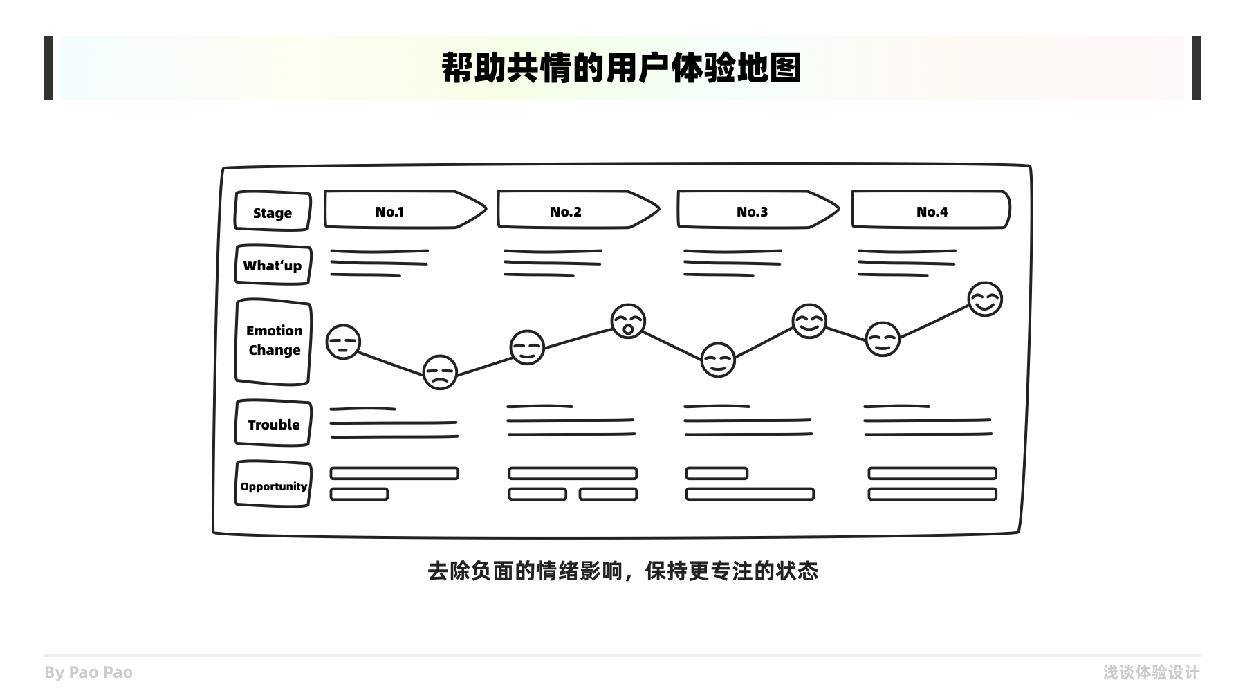 圖表、筆記、錄制設備是幫助我們共情的最好工具,在不同的場景下,這些工具能夠幫助我們更好的收集信息,并且便于我們思考和共情。我們在短時間能記住的信息是有限的,這也是為什么我們會用到7±2這種定律去控制信息量的原因。以用戶體驗地圖為例,在記載用戶體驗產(chǎn)品的過程中,便是一種很好的共情輔助工具,它能夠按照使用步驟或階段記載用戶使用情況和情緒變化等反饋。