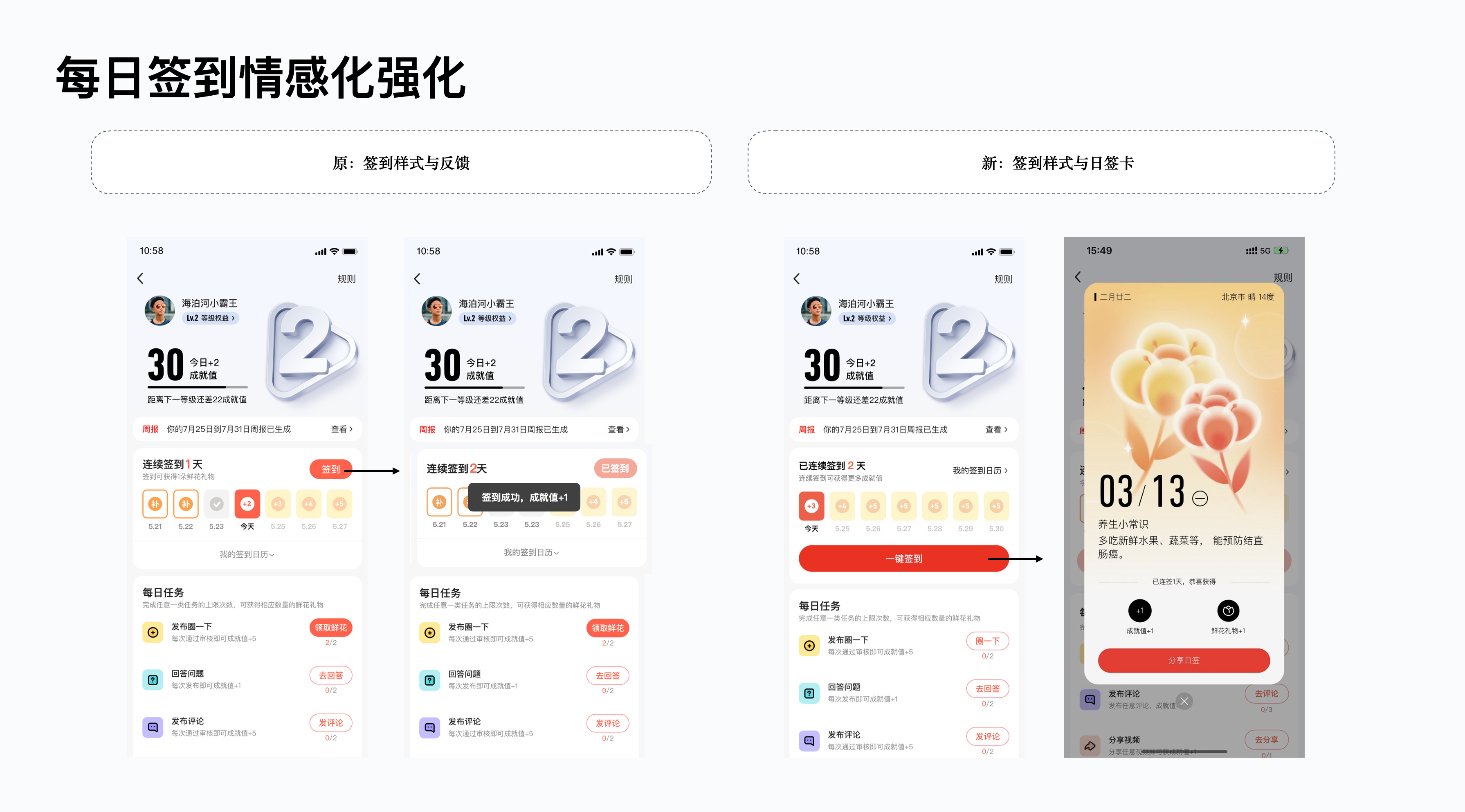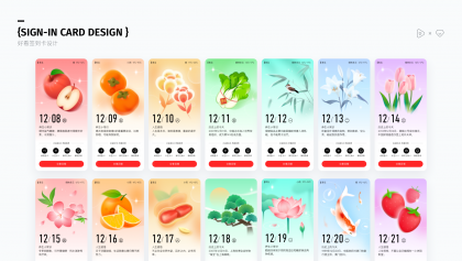 等級中的簽到是最易完成任務(wù)類型,部分老用戶始終堅持簽到,甚至達(dá)到百日以上,表明簽到系統(tǒng)確實能促進(jìn)用戶留存。因此設(shè)計上強化了簽到按鈕與簽到后的反饋,并衍生出了新的簽到反饋——日簽卡。日簽卡以彌散清新的風(fēng)格進(jìn)行對應(yīng)設(shè)計,配合常用的花卉、食材等圖案、文案分別對應(yīng)中年人愛看的人生感悟、養(yǎng)生常識、歷史上的今天,溫馨感十足,上線后還吸引了大量用戶分享保存日簽卡,極大的提升了簽到用戶的次日留存。