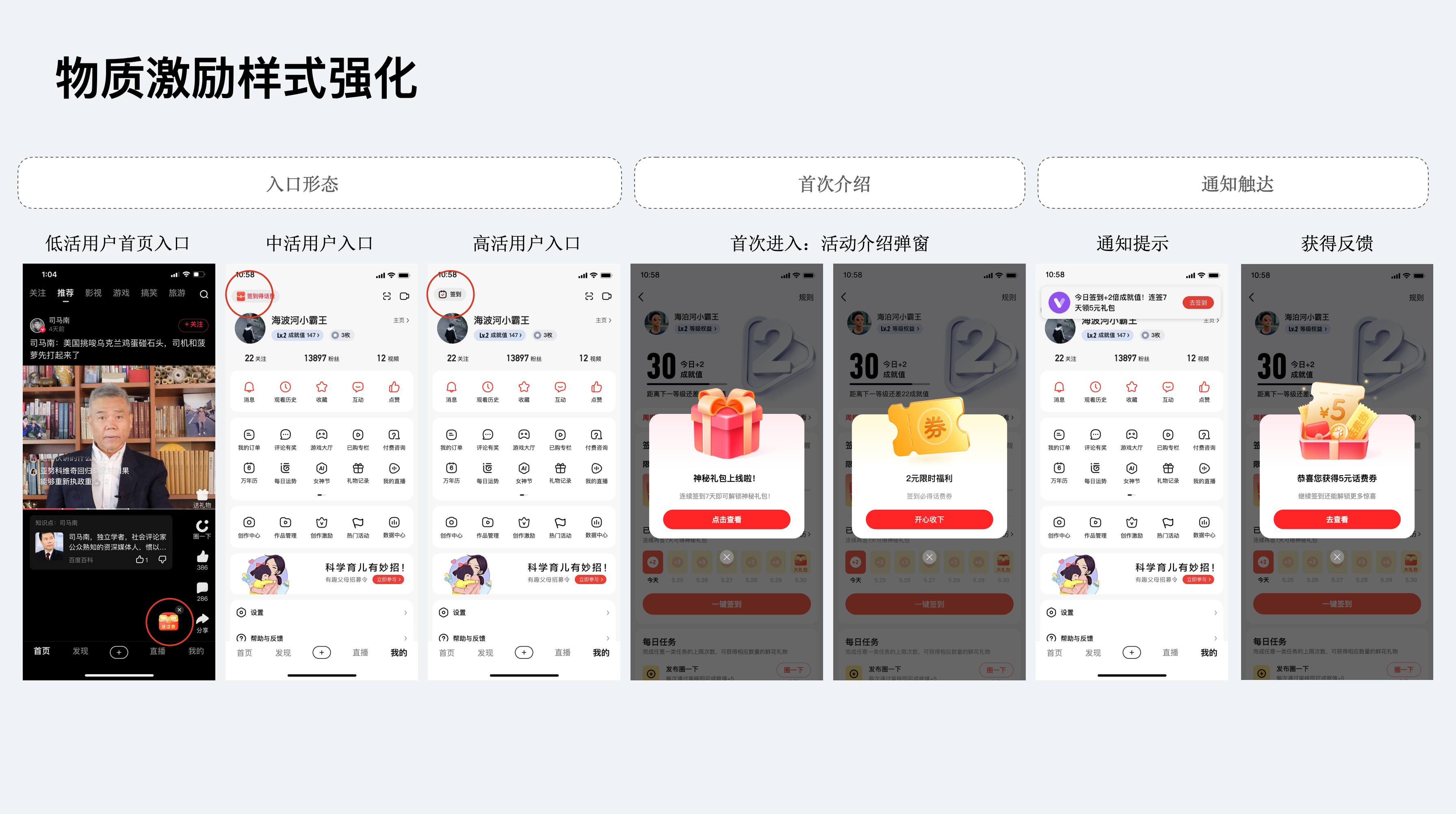 ?入口樣式:低活用戶使用了首頁懸浮球強引導(dǎo)進(jìn)入,同時中低活躍度的簽到入口也增加了紅包的樣式,吸用用戶快速點擊進(jìn)入簽到。