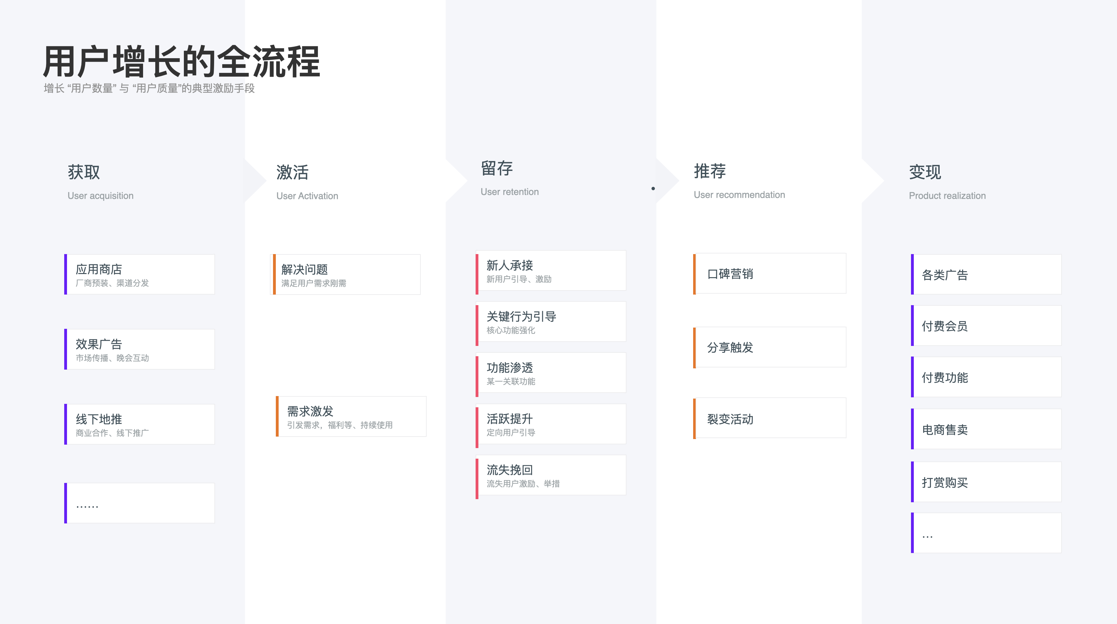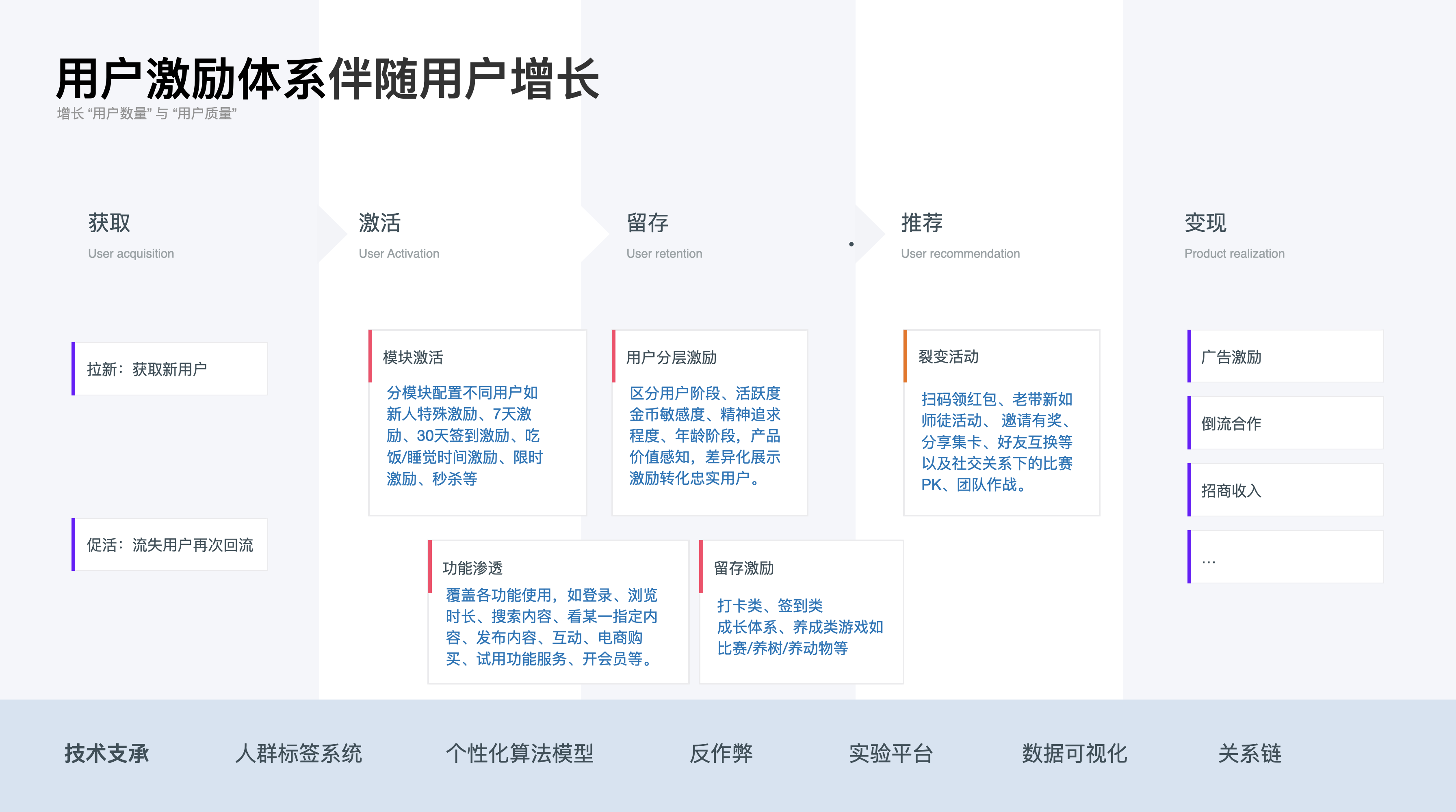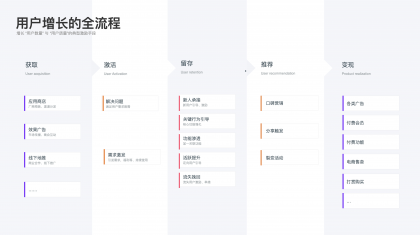 以上是用戶視角下的激勵體系,下面講講產(chǎn)品業(yè)務(wù)下的激勵體系的作用,通常情況下激勵體系伴隨著用戶增長的全流程“獲取—激活—留存—推薦—變現(xiàn)”各個過程。用戶增長代表著增長“用戶數(shù)量”與“用戶質(zhì)量”,以上三類激勵方式都會在產(chǎn)品增長的各流程中承擔(dān)著不同程度的促進(jìn)作用: