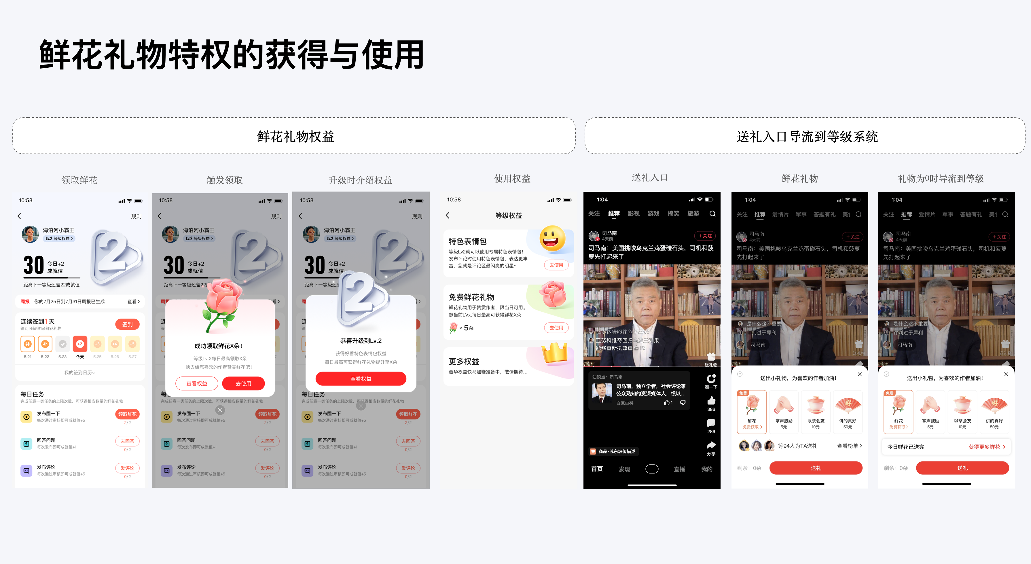 鮮花禮物特權(quán)方面:當(dāng)用戶升級及完成任務(wù)的同時可領(lǐng)取該獎勵,我們采用用戶比較熟知的“授人鮮花,手有余香”的概念,等級越高可獲得更多鮮花,越能鼓勵作者,增進(jìn)了創(chuàng)作者與忠實粉絲之間的關(guān)系。免費禮物是好看視頻的首創(chuàng),雙向促進(jìn)用戶與作者激勵,后續(xù)其他平臺也進(jìn)行了功能跟進(jìn)。在作者的帶動下,當(dāng)用戶想給作者贈送鮮花時為了獲取更多的鮮花,也能導(dǎo)流到任務(wù)系統(tǒng)促進(jìn)等級任務(wù)的完成。