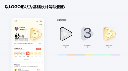 ?決定用戶動機(jī)主要有8個核心的驅(qū)動力:使命感、成就感、創(chuàng)造力、擁有感、社交性、稀缺感、好奇心、逃避心。因此利用用戶對于尊貴等級地位的追求進(jìn)行等級圖標(biāo)設(shè)計,以LOGO形狀為基礎(chǔ)設(shè)計了等級圖形,使用辨識度和認(rèn)知成本較低的數(shù)字進(jìn)行等級彰顯,體現(xiàn)等級的遞進(jìn),同時采用不同顏色突出1至6等級的差異,高等級添加更明顯的金屬感,營造稀有性和高貴感,同時在社交場景如“互動區(qū)”、“個人中心”等,突出用戶身份。