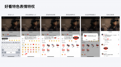 特權(quán)表情方面:我們通過評估5w條好看視頻評論數(shù)據(jù),選出高頻關(guān)鍵詞10條,同時投放到社群用戶中進(jìn)行投票選舉,宣出我們用戶最更偏愛的交流詞匯,最終選出6個表情包文案:支持、點贊、厲害了、說得好、學(xué)到了、好人一生平安。隨后開始根據(jù)這五條內(nèi)容進(jìn)行表情圖案創(chuàng)作,打造具有好看特色、正向有梗的視覺系統(tǒng)。好看用戶下沉且年齡較大,對醒目直白、突出重點、易讀易懂的設(shè)計更偏愛。因此圍繞文字繪制了一套簡單明確又具備詼諧感的表情包圖案,在用戶傳播上也能更易傳播,更能能打造好看品牌的互動記憶點。