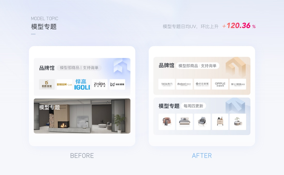 群核下的設(shè)計(jì)工具,以專題化的形式聚類商家、平臺(tái)推薦的模型是基本的運(yùn)營動(dòng)作,如下圖,原本以真實(shí)效果圖的方式展示模型專題,用戶難以感知是方案還是模型。通過封面圖形的優(yōu)化:將核心的模型類型展示出來,用戶能夠預(yù)見里面的內(nèi)容。