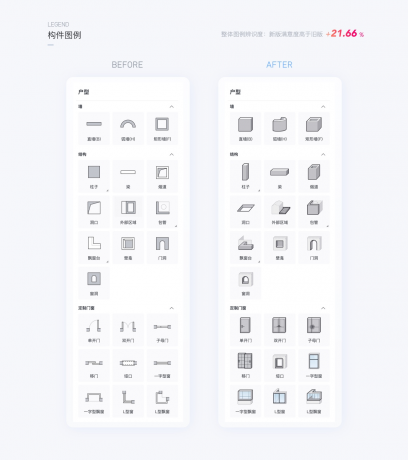 上線后通過問卷調(diào)研用戶滿意度相比舊版提升了21.66%,因此可以證明,更精準(zhǔn)的圖形輔助用戶更高效的使用工具操作。以上是項(xiàng)目小組在試驗(yàn)過程中的部分案例,不再一一列舉所有的試驗(yàn)案例,可以看到信息表達(dá)的精準(zhǔn)度、直觀度是能夠?qū)I(yè)務(wù)產(chǎn)生直接的正向結(jié)果,鑒于群核下的工具產(chǎn)品有大量的應(yīng)用圖標(biāo)圖例,借此我們重新排查和校準(zhǔn)了很多圖標(biāo),確保表達(dá)相對(duì)精準(zhǔn),提高用戶信息識(shí)別的精準(zhǔn)度與效率。