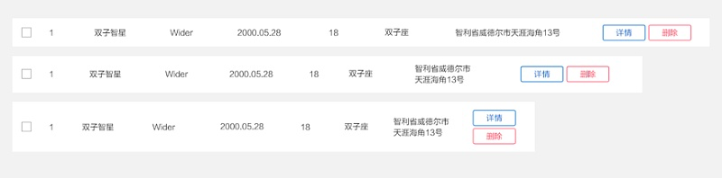 當(dāng)寬度拖到第三種情況,按鈕也出現(xiàn)了換行,那每一行的高度都應(yīng)該按照這個(gè)高度保持一致,即使有一些數(shù)據(jù)只有一個(gè)按鈕/地址并沒有出現(xiàn)換行,如圖: