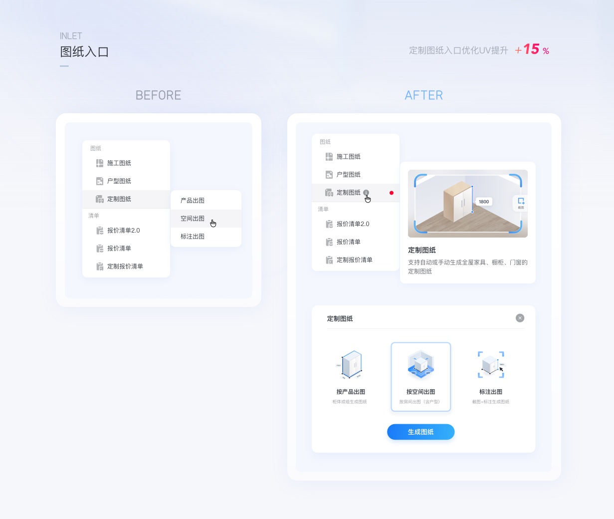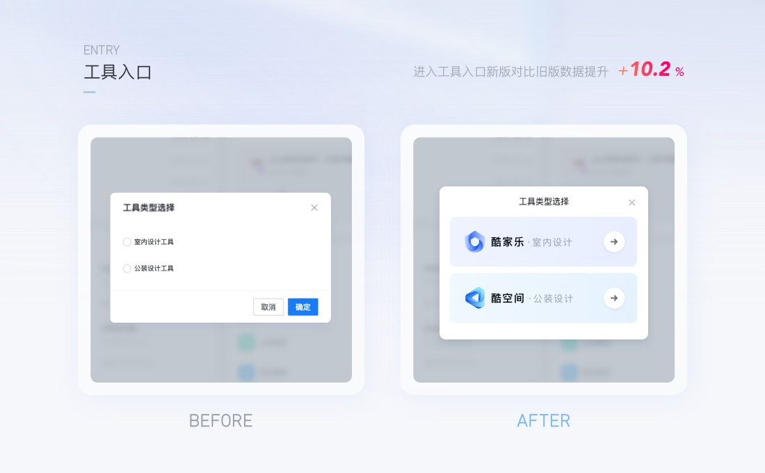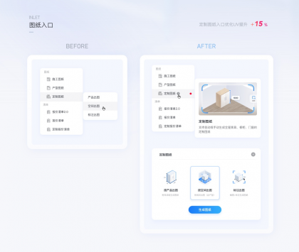 在新版優(yōu)化中圖形化的表達(dá)了圖紙類型的差異,即便增加了流程步驟數(shù),最終用戶點擊圖紙的UV提升了15%,此案例可以說明,更精準(zhǔn)有效的對象表達(dá)能吸引更多用戶來使用此功能,對業(yè)務(wù)產(chǎn)生直接效果。