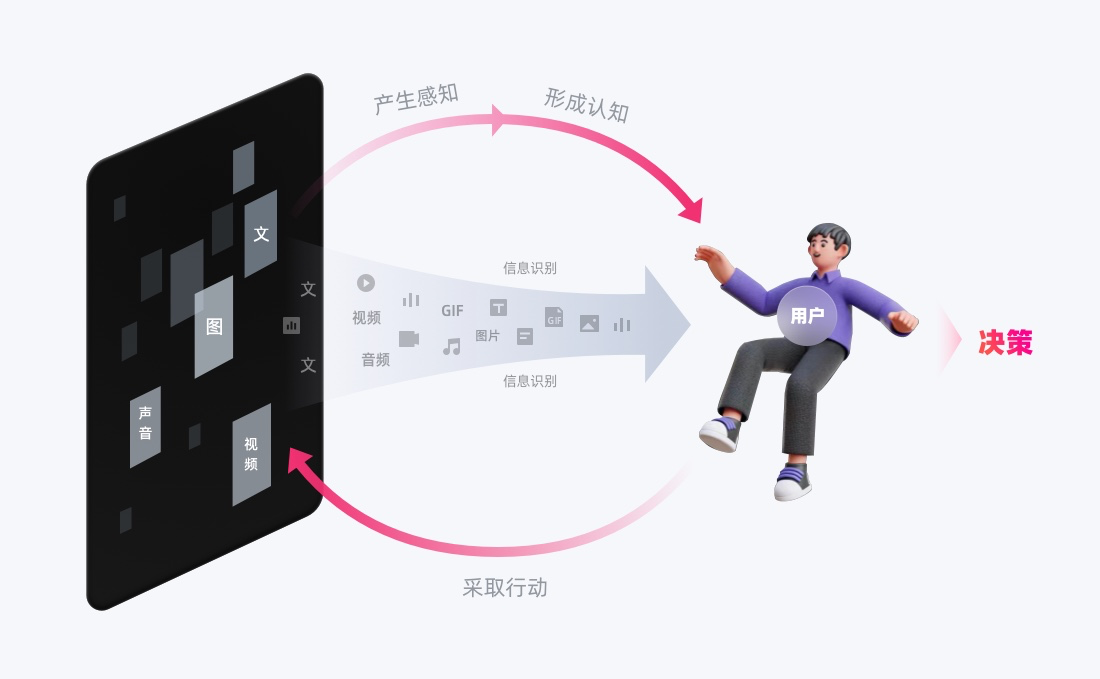 信息識別,可簡單理解為:感知到(看到/聽到)信息,并能夠理解它。本質(zhì)是在用戶與界面交互中,會經(jīng)歷「感知信息→認(rèn)知信息→做出決策與行動」的歷程,從感知到認(rèn)知,是信息獲取和辨識理解的過程,即「信息識別」。
