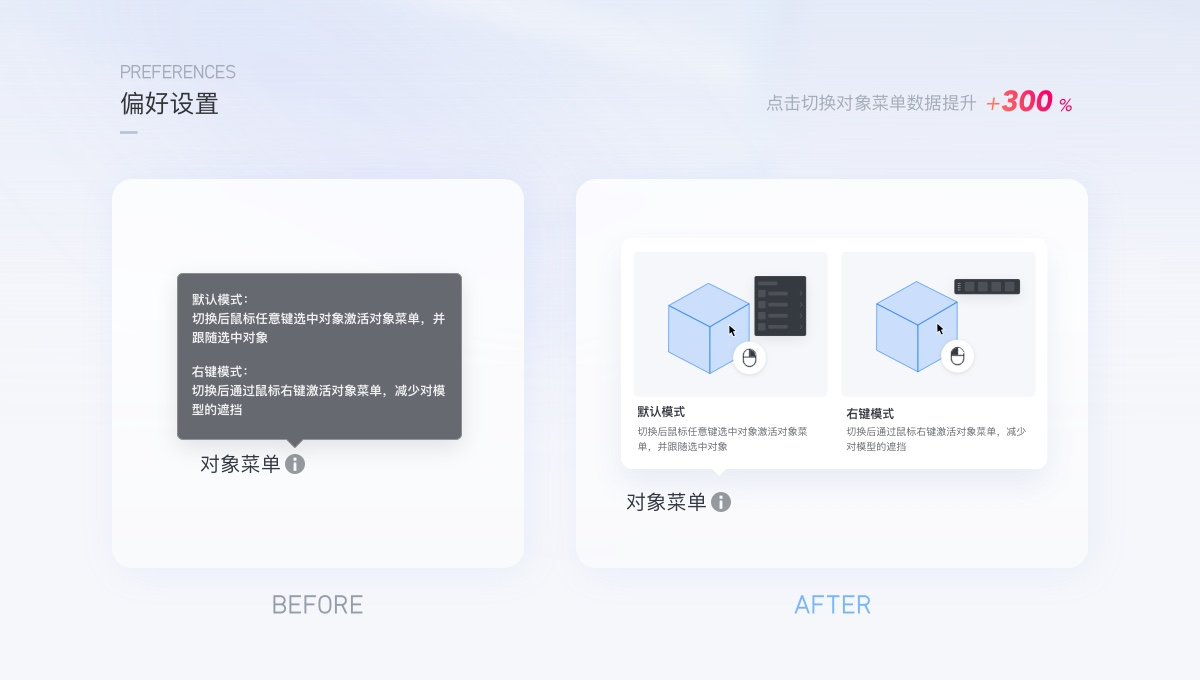 案例3:對象菜單鼠標(biāo)偏好設(shè)置在設(shè)計工具中,選擇對象喚出菜單,在酷家樂工具中可以設(shè)置為鼠標(biāo)左鍵點擊即喚出菜單(僅展示圖標(biāo)),也可以鼠標(biāo)右鍵喚出菜單(圖標(biāo)文字結(jié)合)。