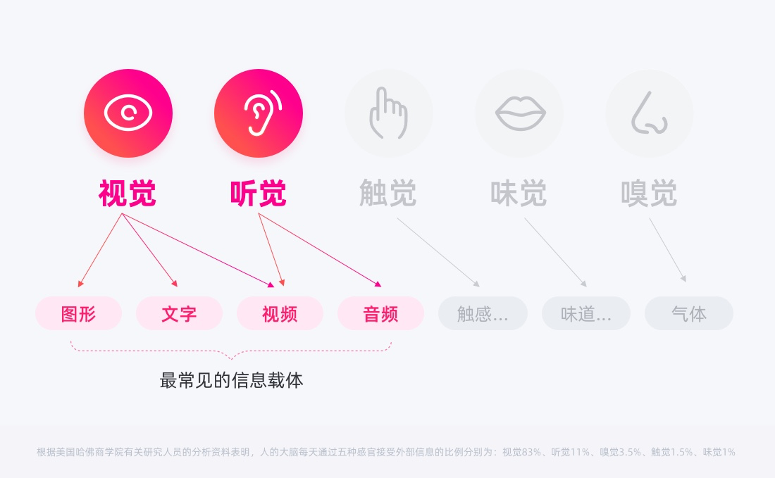 根據(jù)美國哈佛商學(xué)院有關(guān)研究人員的分析資料表明,人的大腦每天通過五種感官接受外部信息的比例分別為:視覺83%、聽覺11%、嗅覺3.5%、觸覺1.5%、味覺1%(數(shù)據(jù)暫不涉及短視頻直播領(lǐng)域)在群核體系下的產(chǎn)品,圖和文分別是有哪些?
