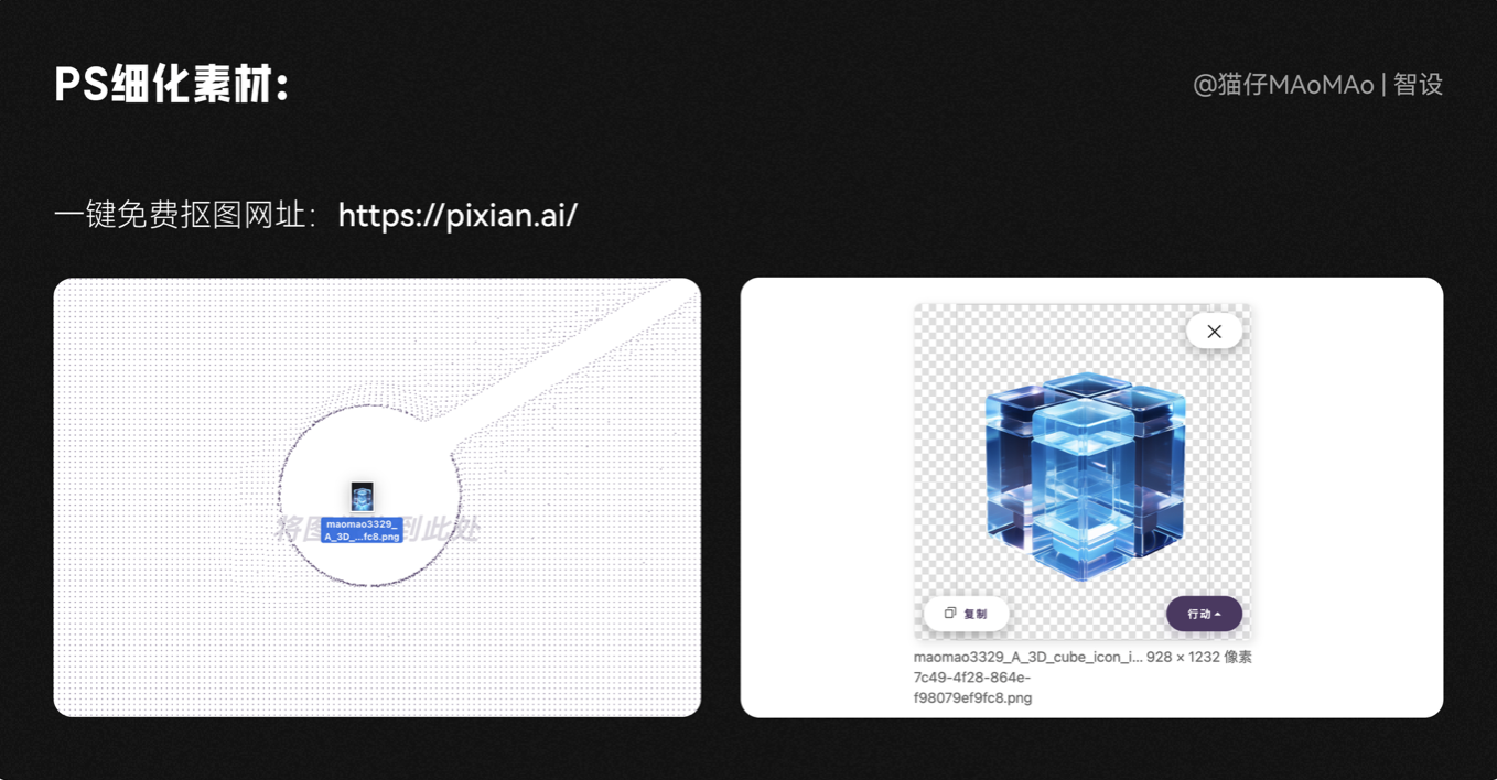 3D主視覺(jué)的部分,我們需要先進(jìn)行摳圖,如果不想使用 PS 手動(dòng)摳圖,這里推薦我常用的一鍵免費(fèi)摳圖網(wǎng)站:https://pixian.ai/ ,處理簡(jiǎn)單的圖片,直接把圖片扔進(jìn)去就好了,簡(jiǎn)單好用~