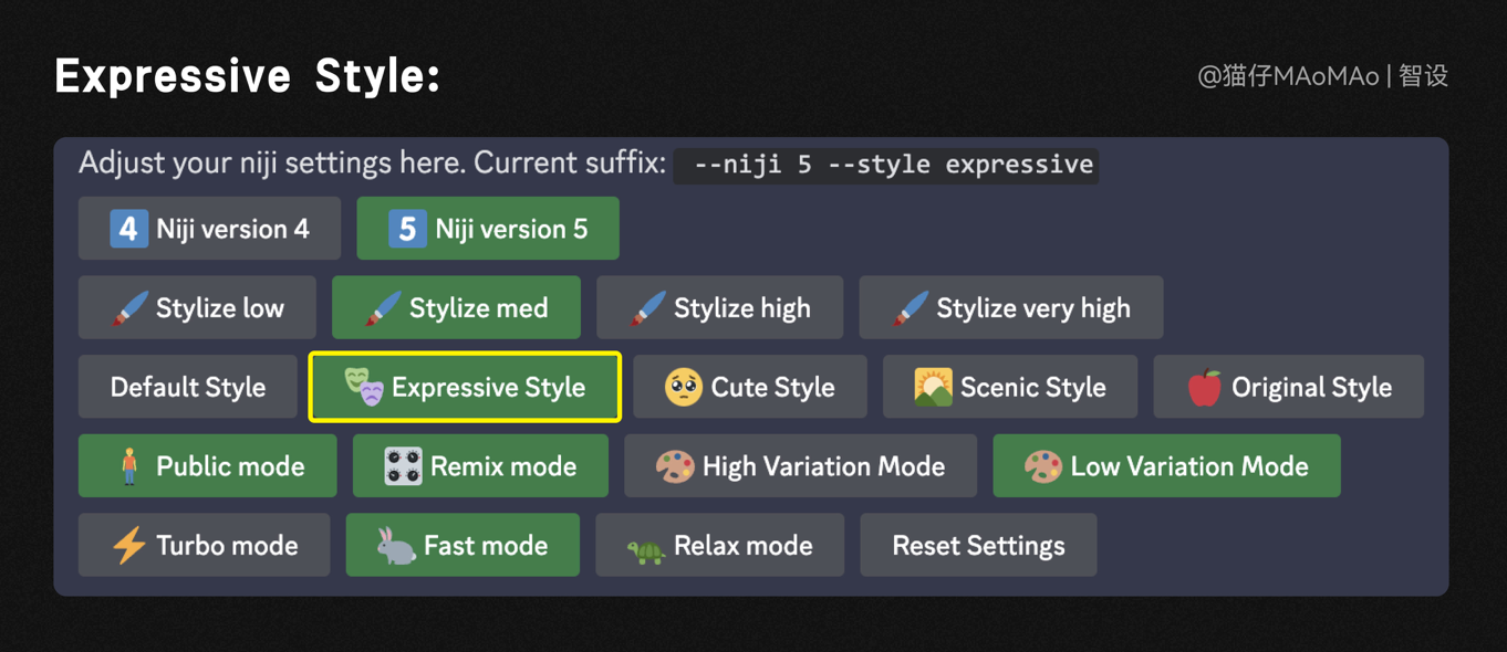 因?yàn)槭菃蝹€(gè)元素生成,背景環(huán)境關(guān)鍵詞可以省略,大家在編寫關(guān)鍵詞時(shí),注意靈活增減,不用一定按照所謂的公式來(lái)寫,藝術(shù)風(fēng)格是插畫素材,我們直接使用niji模型,其中expressive風(fēng)格會(huì)讓插畫更加富有表現(xiàn)力,可以直接在關(guān)鍵詞后面加上后綴“--style expressive ”,或者用“/settings”命令,更改設(shè)置。