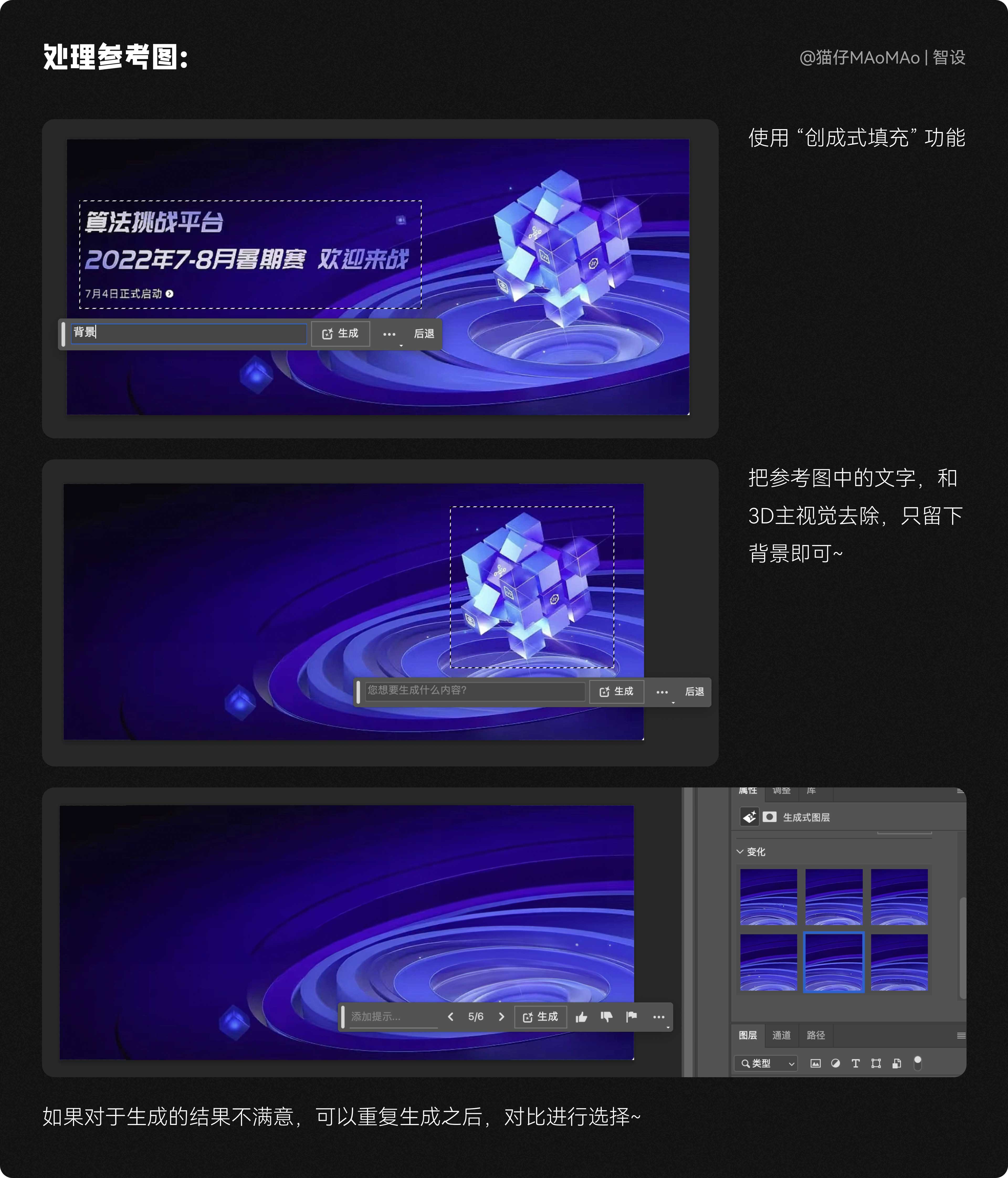 盡管AI現(xiàn)在可以輔助我們進(jìn)行設(shè)計(jì),但設(shè)計(jì)師的審美和基本功仍然至關(guān)重要,在輸出核心素材時(shí),我們需要通過(guò)不斷微調(diào)細(xì)節(jié),從大量素材中精挑細(xì)選出最合適的那一個(gè),最終得到我們需要的背景素材圖。