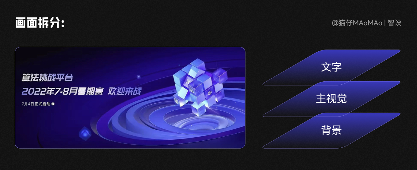 確定參考方向后,腦袋里面大致有了畫面思路,主視覺(jué)在畫面右方,螺旋狀背景突出主視覺(jué),文字排版在左邊,整體色調(diào)為藍(lán)色+青色光感。這里我們對(duì)所選參考圖進(jìn)行拆分:
