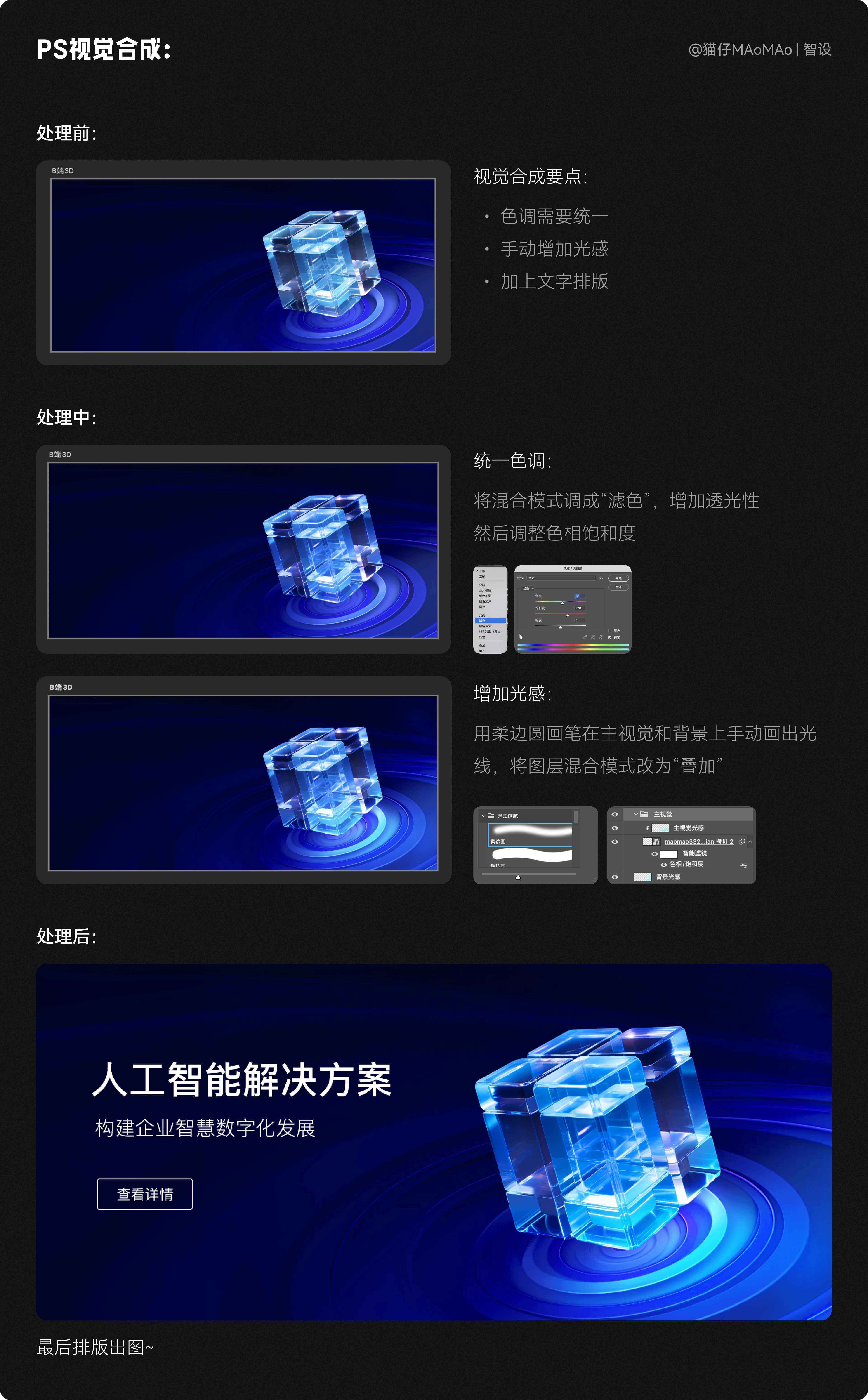這一步考驗(yàn)的是設(shè)計(jì)師的審美和手活,我們需要把背景和主視覺(jué)素材,進(jìn)行視覺(jué)合成,其實(shí)也非常簡(jiǎn)單:這里我定的主要色調(diào)是藍(lán)色+青色的光感,首先需要將色調(diào)整體統(tǒng)一;然后想要表現(xiàn)出玻璃質(zhì)感的通透,我們需要加上一些光感;最后文字排版出圖即可~