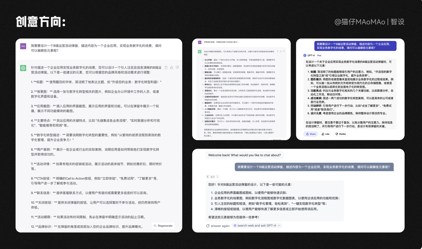 在沒(méi)有設(shè)計(jì)方向的時(shí)候,不妨讓AI大語(yǔ)言模型來(lái)幫助我們,它會(huì)根據(jù)需求的業(yè)務(wù)場(chǎng)景,給出合理的內(nèi)容建議,以及畫面元素的建議。