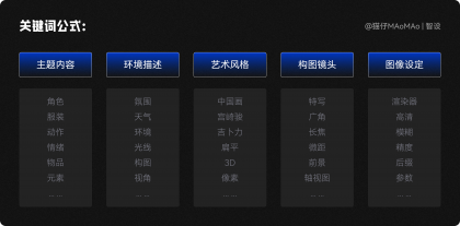 3D主視覺(jué)我們采用文生圖的方式制作,寫關(guān)鍵詞的基本公式參考下圖,具體寫關(guān)鍵詞時(shí),需要靈活進(jìn)行增減,然后不斷嘗試,直到出現(xiàn)自己滿意的效果。