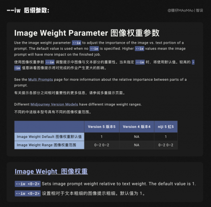 這個(gè)時(shí)候不要慌,也不要著急去改關(guān)鍵詞,我們只需要添加上一個(gè)神奇的后綴“--iw 2”,官方文檔的翻譯中,這個(gè)參數(shù)叫做“圖像權(quán)重參數(shù)”,用來(lái)調(diào)整關(guān)鍵詞中文本與參考圖的相似度,默認(rèn)值為 1 ,范圍為 0~2 ,值越高,生成的圖與原圖更像,注意在 V5 和 niji 模型中使用才能生效。