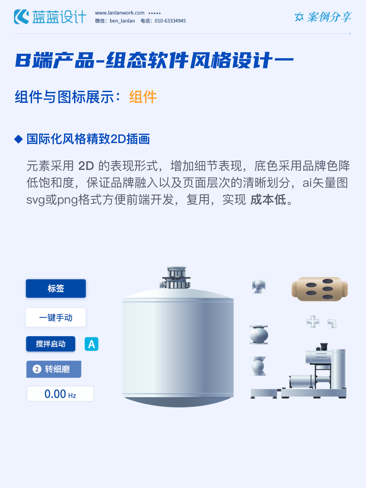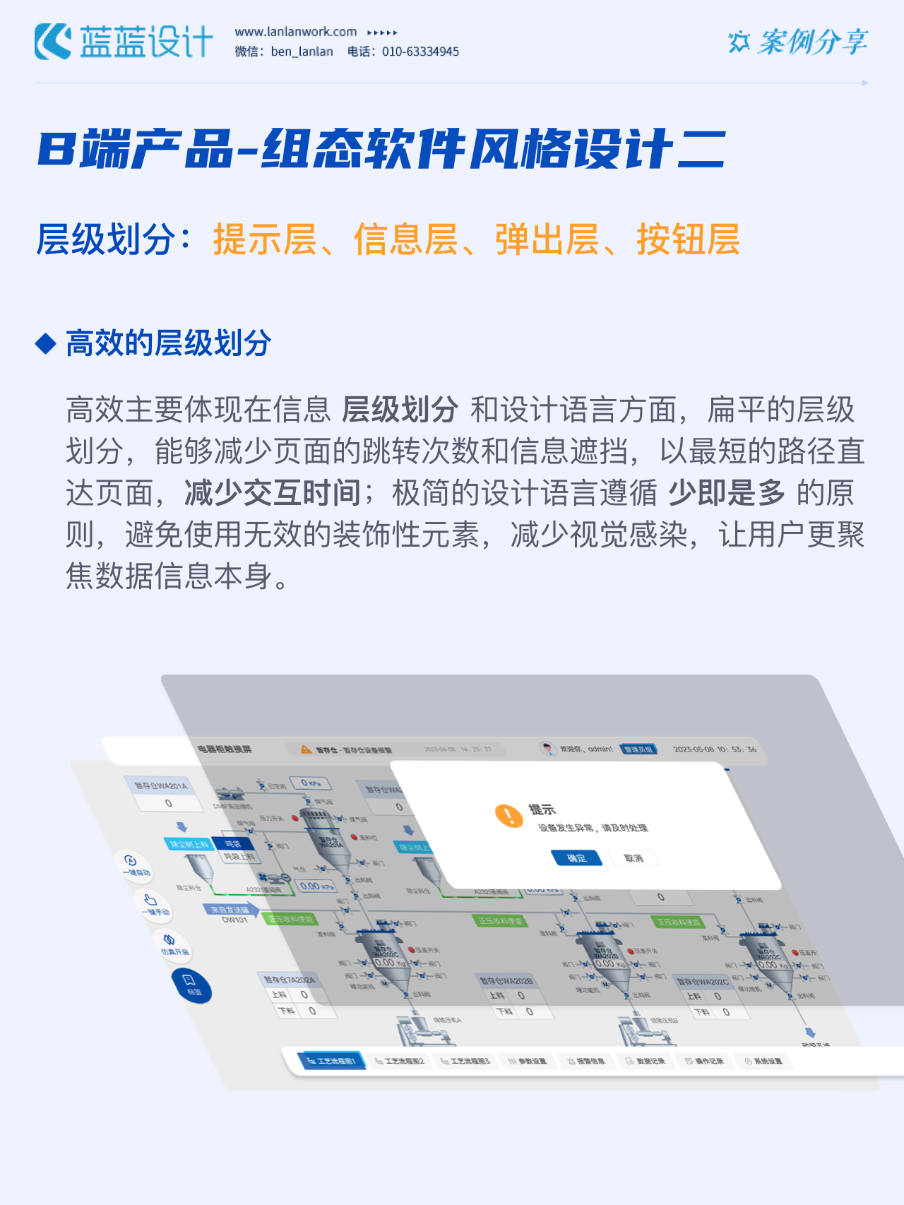藍藍設(shè)計的兩種組態(tài)軟件風(fēng)格都采用符合當(dāng)下審美潮流的2D插畫效果,既保證了視覺效果美觀的同時也降低落地成本,方便后續(xù)的拓展、修改、提升與設(shè)計效率,同時注重用戶的閱讀習(xí)慣,將原功能點重新布局,主次內(nèi)容對比明顯,降低視覺噪音,保證清晰順暢的操作,提升用戶體驗!
