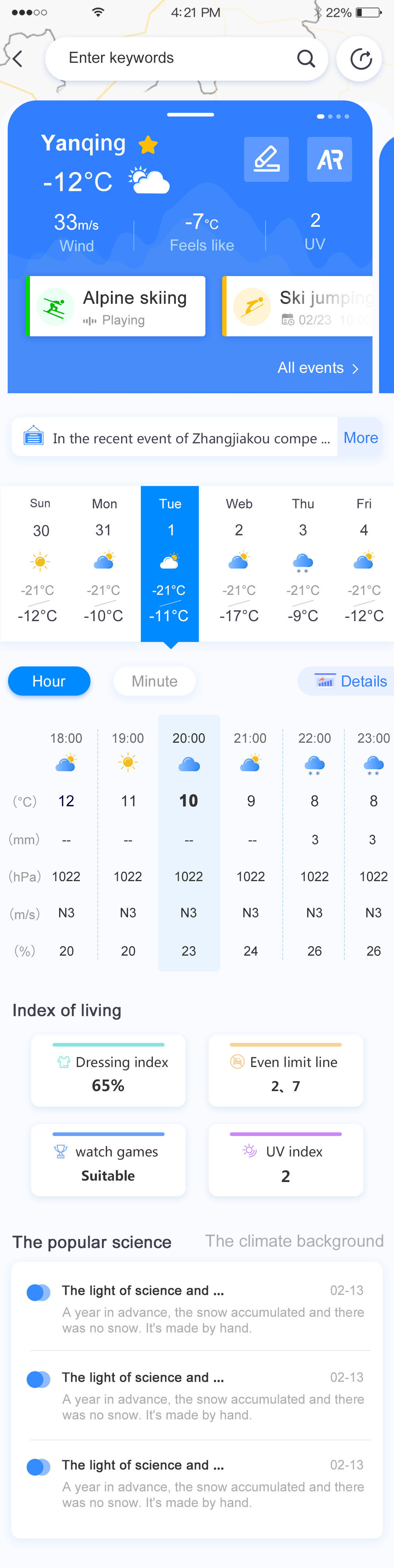 天氣綜述模塊,天氣綜述只要是展示近段時內(nèi)總體的一個天氣情況,可以給將要來參賽或者觀賽人員的一個友好告知,做好相對應的準備。