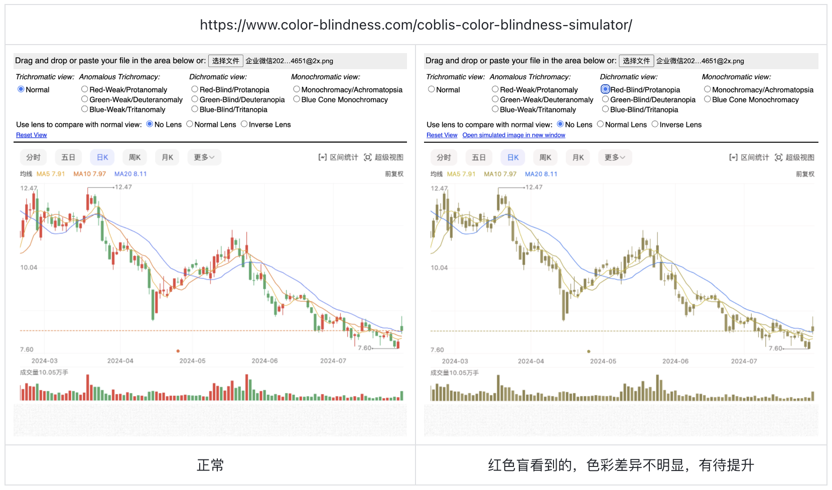 在股票市場(chǎng)中,顏色編碼是信息傳達(dá)的重要手段。許多分析工具使用紅色和綠色來(lái)表示虧損和盈利,這種直觀的視覺(jué)信號(hào)對(duì)大多數(shù)投資者十分有效。然而,色盲投資者在分析市場(chǎng)動(dòng)態(tài)時(shí),往往因無(wú)法準(zhǔn)確分辨這些顏色而產(chǎn)生誤解,影響他們的決策能力。例如,紅綠色盲的投資者在分析股票個(gè)股時(shí),可能會(huì)混淆紅色和綠色的蠟燭圖,導(dǎo)致錯(cuò)誤的投資判斷。