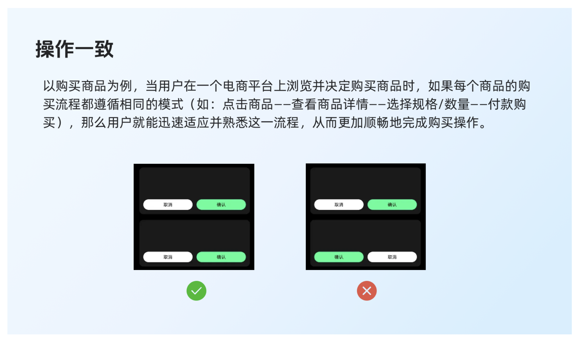 “一致性”作為規(guī)則或手段,服務(wù)于提升用戶體驗的原則。規(guī)則與原則一致時,促進業(yè)務(wù)共識與用戶價值;沖突時,原則優(yōu)先。用戶體驗原則指導(dǎo)下的一致性,要超越表面控件統(tǒng)一,更在于產(chǎn)品決策與價值取向的一致。必要時,為更好的用戶體驗,可在規(guī)則上讓步以實現(xiàn)原則統(tǒng)一。打破規(guī)則需慎重權(quán)衡,確保用戶便利足以彌補理解成本,需長期全局考量。規(guī)則非僵化教條,而是引導(dǎo)我們謹(jǐn)慎創(chuàng)新的框架。