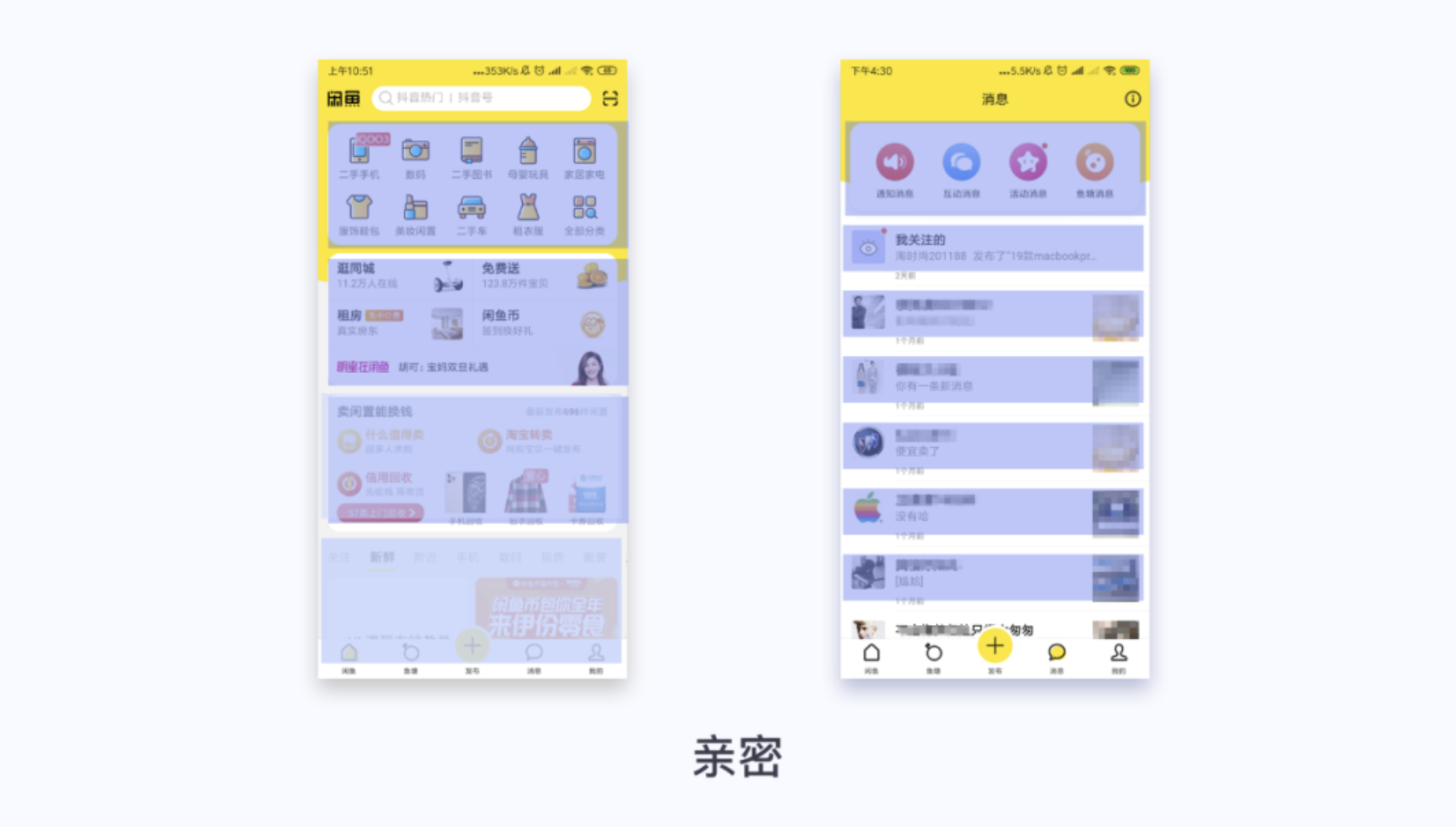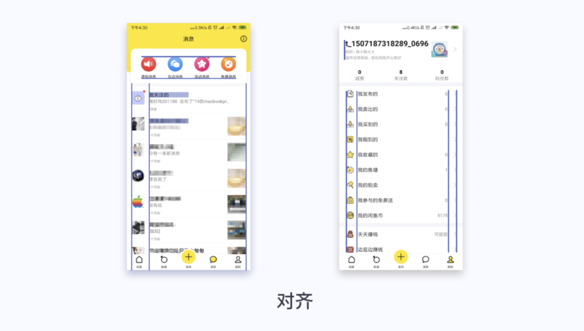 閑魚消息頁面頂部功能區(qū)域采用居中對齊方式,比較正式一些,突出顯示引導用戶點擊;個人頭像和消息左對齊顯示,發(fā)布圖片右對齊顯示。