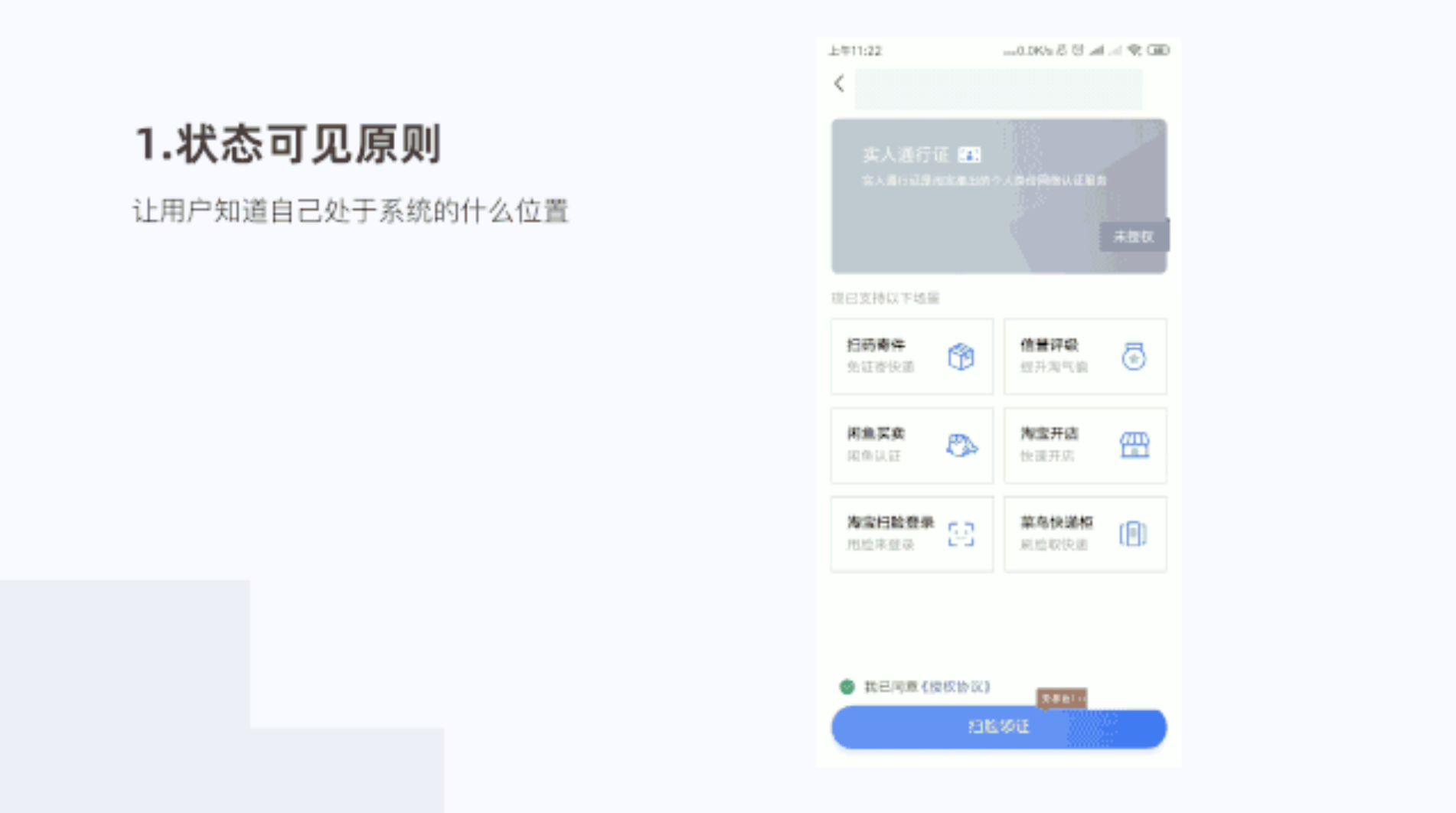 在閑魚頁面我們系統(tǒng)的標題欄、TAB欄的提示貫穿整體,用戶知道我們所處的什么頁面。比如認證提示,每一步告知用戶進行到哪里了。