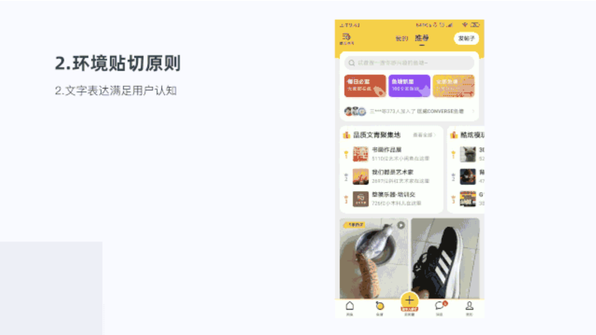 在魚塘頁面,文藝書畫、樂器等興趣魚塘,我們叫品質(zhì)文青聚集地,文藝青年在當下比較火的網(wǎng)絡名詞,喜歡文化藝術的青年哈哈。符合用戶年齡人群的環(huán)境認知。