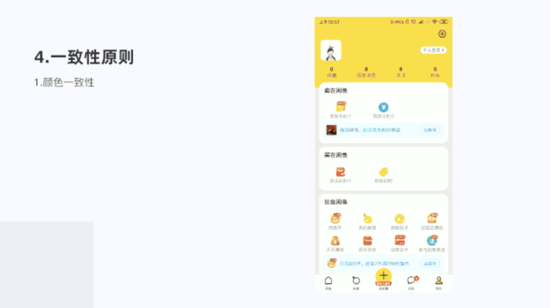 閑魚的我的頁面,每個區(qū)塊進行功能區(qū)分,分為買、賣、玩、其他4個主要部分。降調(diào)層級,同時在區(qū)塊內(nèi)每個功能圖標宮格顯示,也易于用戶查找,滿足了易掃原則,提示了用戶體驗。