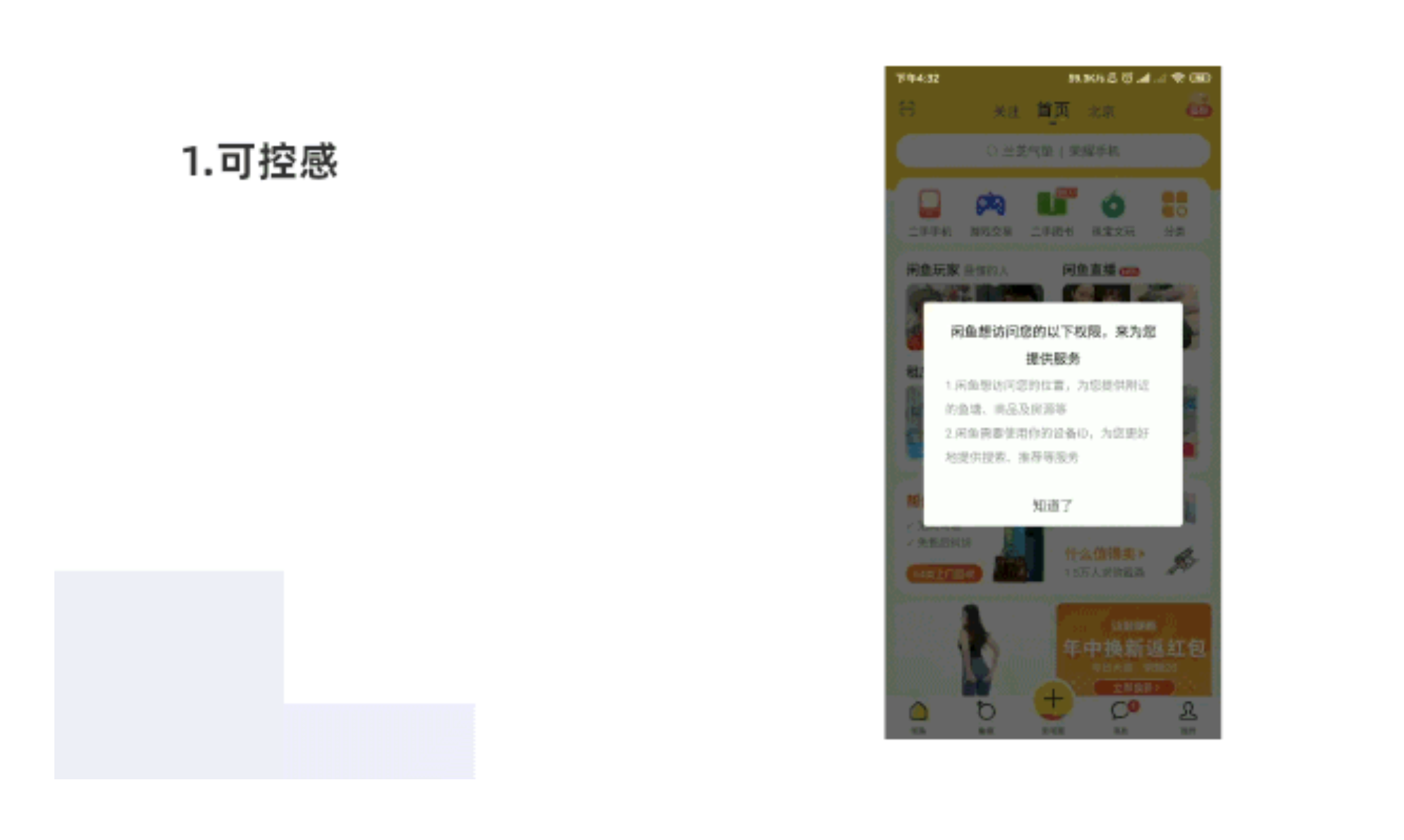 閑魚用戶登錄之后需要獲取權限,告知用戶選擇是否授權于產(chǎn)品這些權限,讓用戶操作可控。