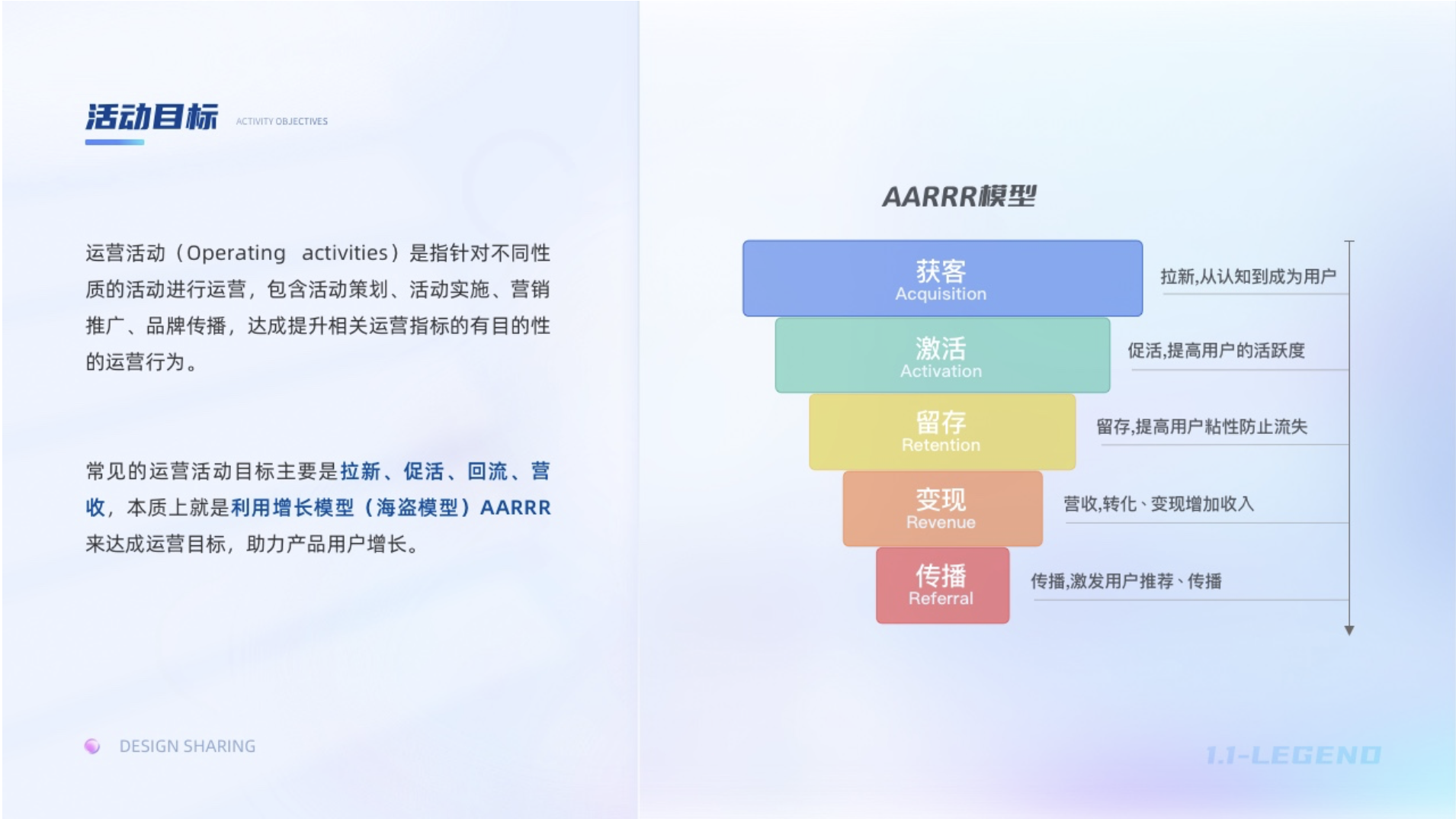 運營活動(Operating activities)是指針對不同性質的活動進行運營,包含活動策劃、活動實施、營銷推廣、品牌傳播,達成提升相關運營指標的有目的的運營行為。為了更好的達成既定目標,項目立項后我們需要了解此次運營活動的目標,以目標展開設計策略和設計實施。常見的運營活動目標主要是拉新、促活、回流、營收,本質上就是利用增長模型AARRR來達成運營目標,助力產(chǎn)品用戶增長。