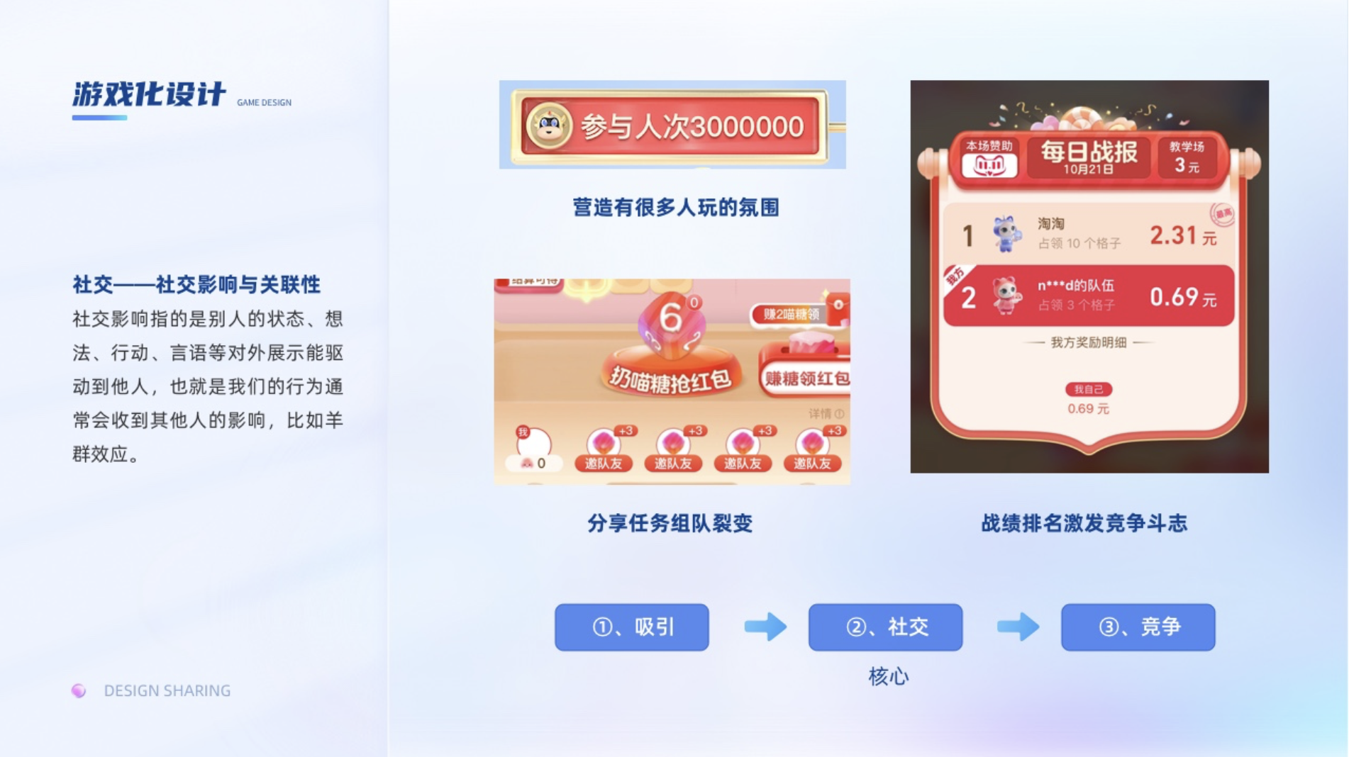 社交影響指的是別人的狀態(tài)、想法、行動、言語等對外展示能驅動到他人,也就是我們的行為通常會收到其他人的影響,比如羊群效應。就像看抖音,點贊量多的,沒準我們會跟有耐心看到最后,因為有個潛意識心理就是大家都覺得好,總之差不到哪里去。在游戲和運營活動中,營造有很多人玩的氛圍,鼓勵用戶炫耀自己的成果都是非常見效的方式。關聯(lián)性我理解為我們會選擇盡可能與我們有關聯(lián)的事物。比如拼多多推薦你去分享,都是優(yōu)先推薦與你互動最為頻繁的,這樣去拼單和拼單成功的幾率更高。