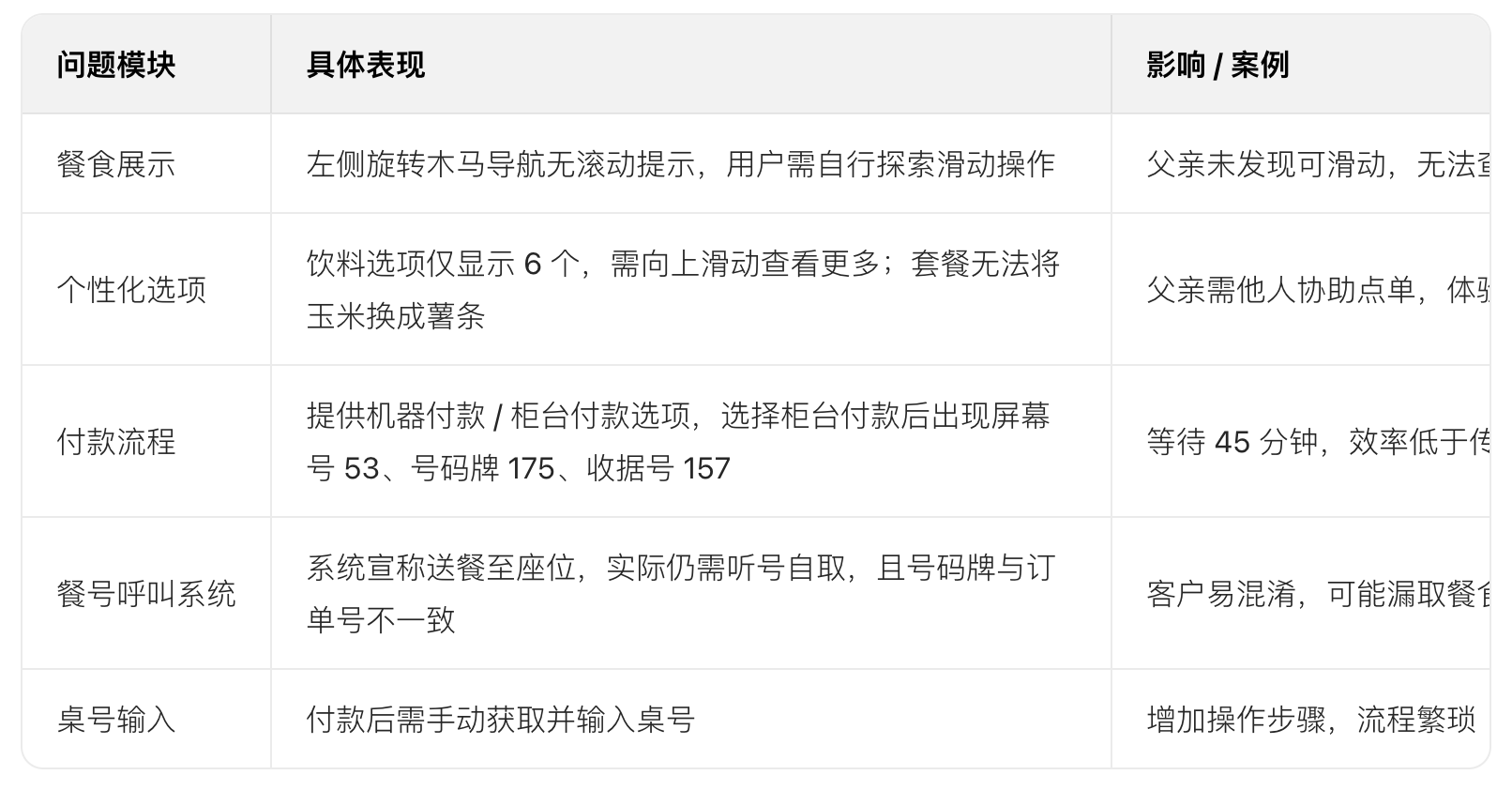 答案:付款選項設(shè)置矛盾(機器付款與柜臺付款并存),且選擇柜臺付款后出現(xiàn)三種號碼(屏幕號 53、號碼牌 175、收據(jù)號 157),導(dǎo)致用戶等待 45 分鐘,遠(yuǎn)超快餐行業(yè)常規(guī)等待時間。