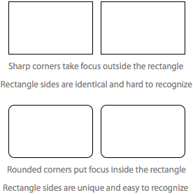 尖角指向外側(cè),會降低矩形內(nèi)部內(nèi)容的視覺焦點(diǎn)。當(dāng)兩個(gè)矩形相鄰時(shí),尖角也使得難以區(qū)分矩形的兩邊。這是因?yàn)榫匦蔚拿織l邊都是直線。圓角矩形的邊是獨(dú)一無二的,因?yàn)檫@些線條會向其所屬的矩形彎曲。