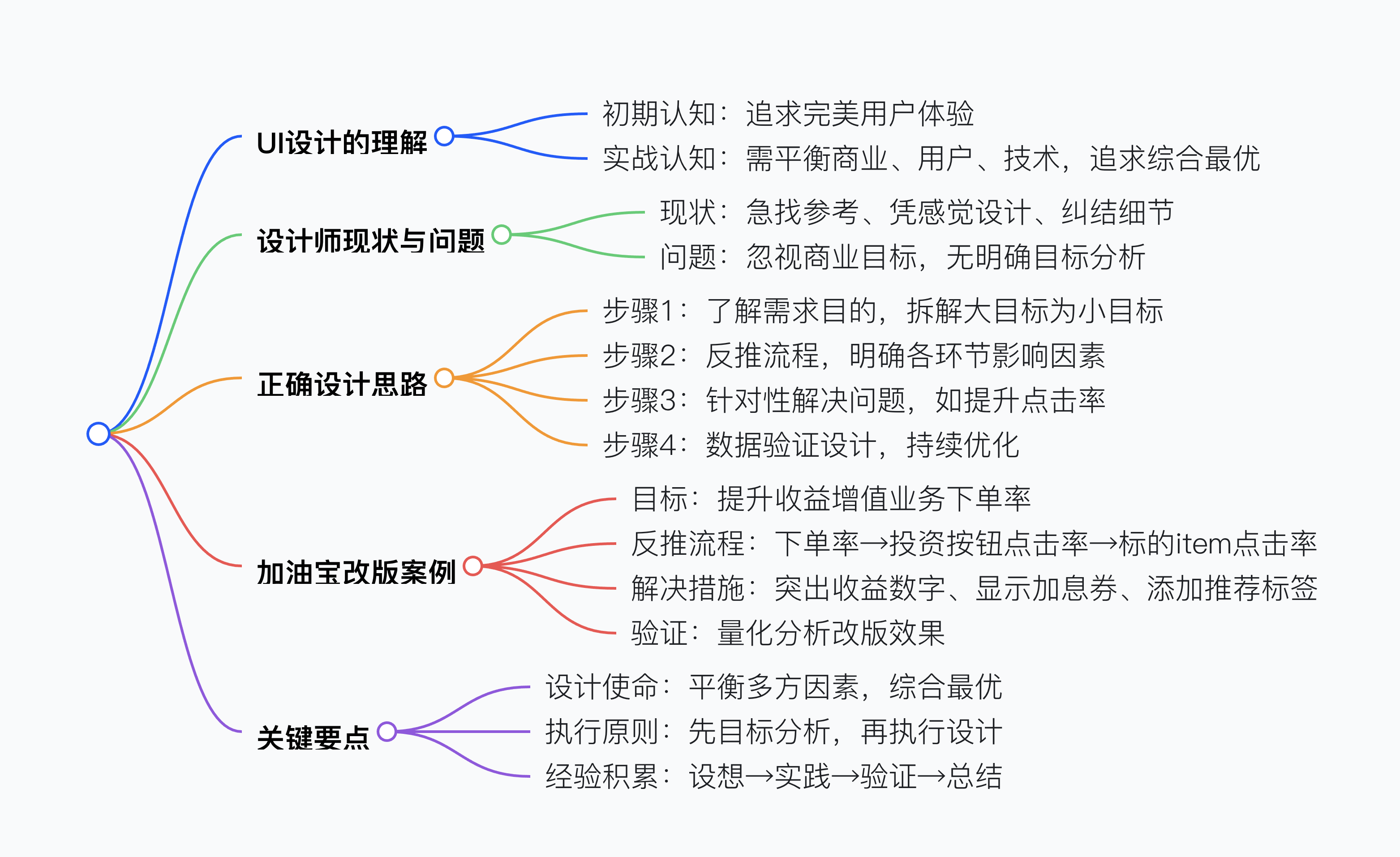 - 接到需求先了解目的,將大目標(biāo)拆分為可執(zhí)行的小目標(biāo)。例如加油寶 APP6.0 改版時(shí),核心目標(biāo)為提升「收益增值業(yè)務(wù)下單率」,拆解為:提升標(biāo)的 item 點(diǎn)擊率→提升「立即投資」按鈕點(diǎn)擊率→提升支付確認(rèn)點(diǎn)擊率。