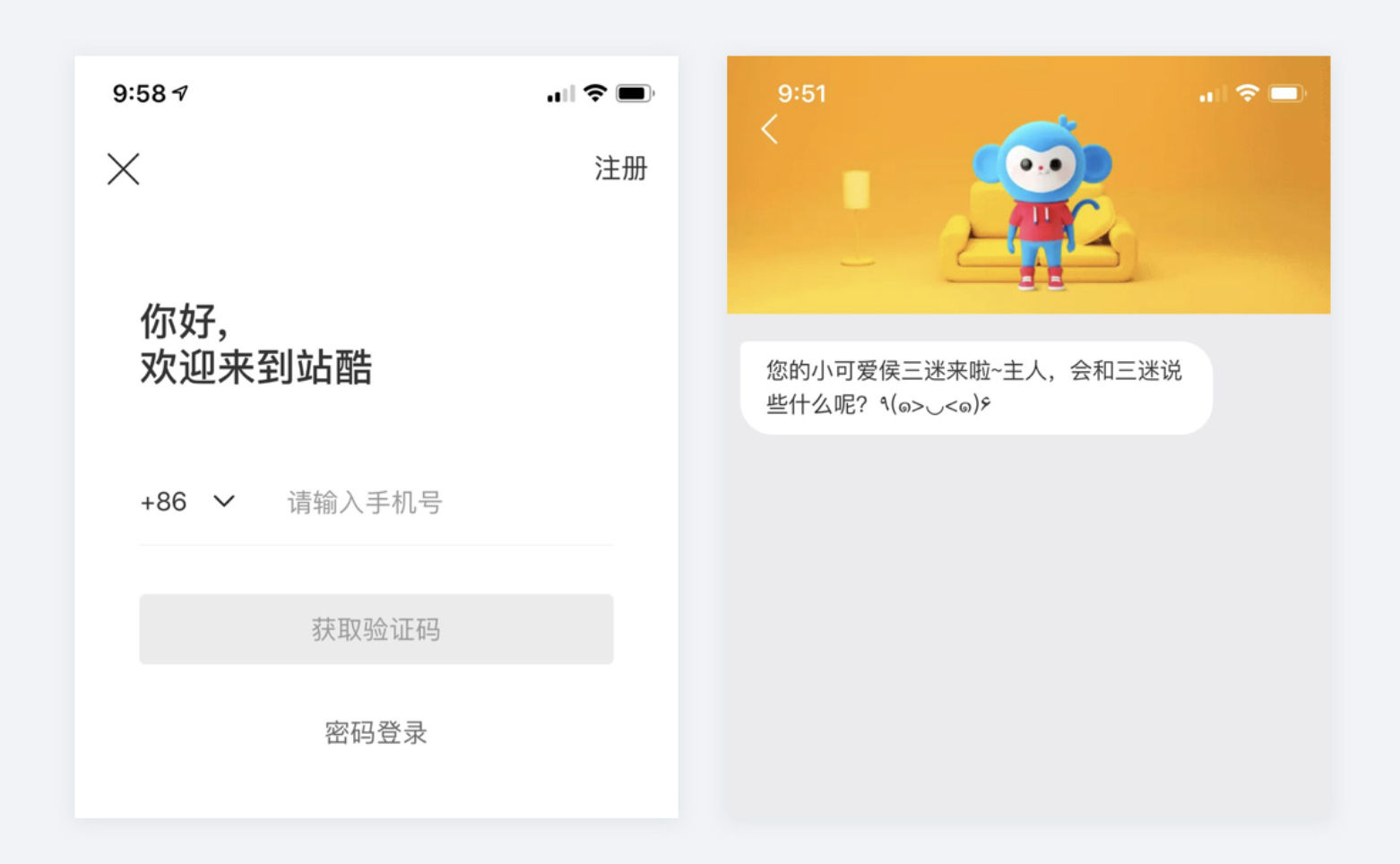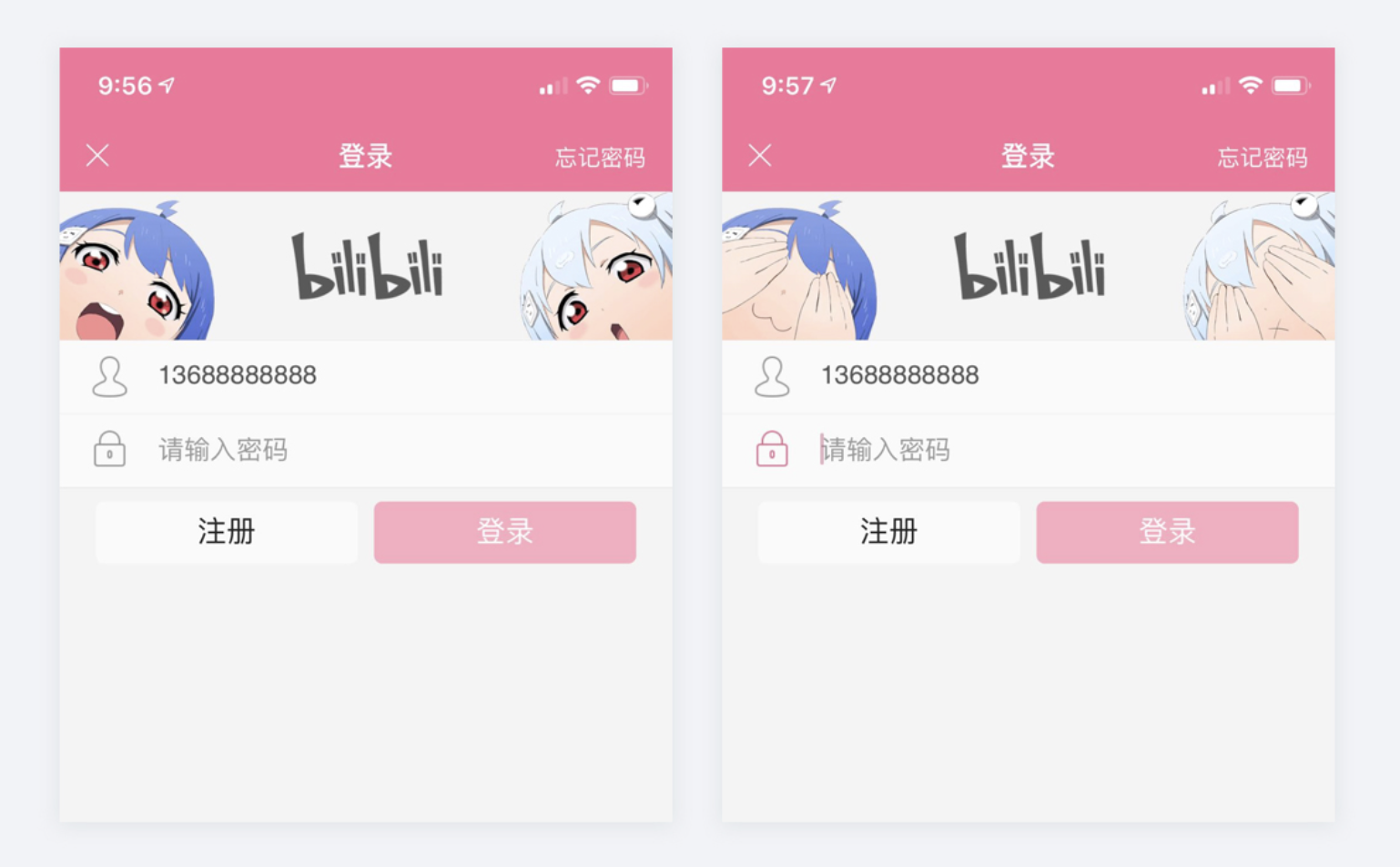 - 有趣的擬人化動作設(shè)計:產(chǎn)品作出擬人化互動反饋,讓用戶感到有趣,如嗶哩嗶哩 APP 登錄輸入密碼時,IP 形象 22 和 33 會把眼睛捂起來,給用戶安全感且有趣。
