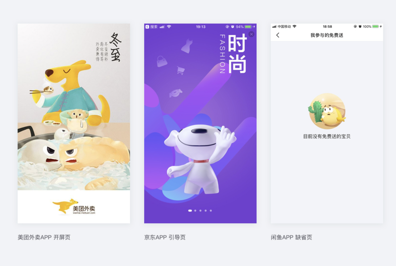 - 獨特的 IP 形象設(shè)計:識別度高的 IP 形象帶給用戶親切感,拉近用戶與產(chǎn)品、企業(yè)的關(guān)系,打造品牌效應(yīng)并延展融入日常生活,如美團外賣 APP 開屏頁、京東 APP 引導(dǎo)頁、閑魚 APP 缺省頁等展示企業(yè) IP 形象。