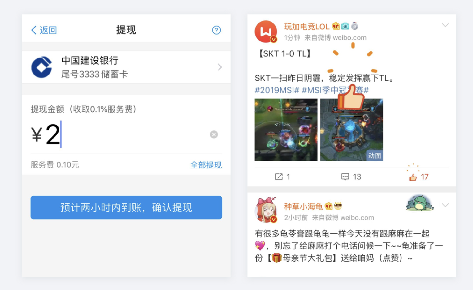 - 符合預(yù)期與超出預(yù)期的設(shè)計:交互設(shè)計遵循操作前可預(yù)知、操作中有反饋、操作后可撤銷原則,符合用戶預(yù)期并增加超出預(yù)期反饋,如支付寶 APP 提現(xiàn)預(yù)先告知到賬時間,微博 APP 點贊彈出點贊圖標(biāo)小動畫。