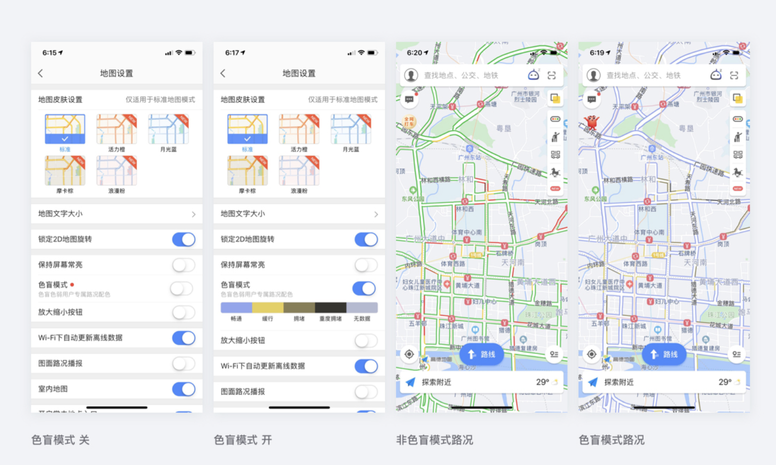 - 無障礙化的設(shè)計:重視服務(wù)特殊人群的設(shè)計,體現(xiàn)人文關(guān)懷和產(chǎn)品合理性、智能性,如高德地圖 APP 為色盲人群提供專屬路況信息顏色開關(guān)并可隨意編輯顏色。
