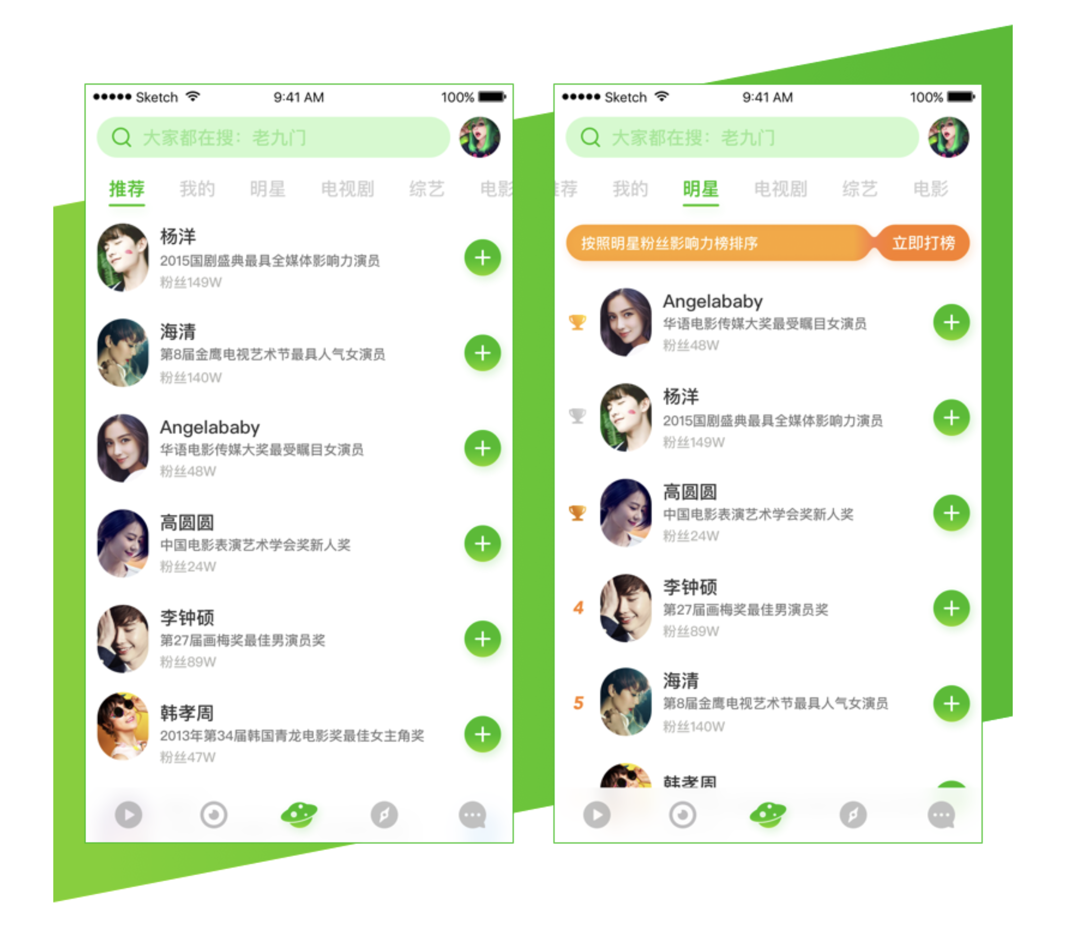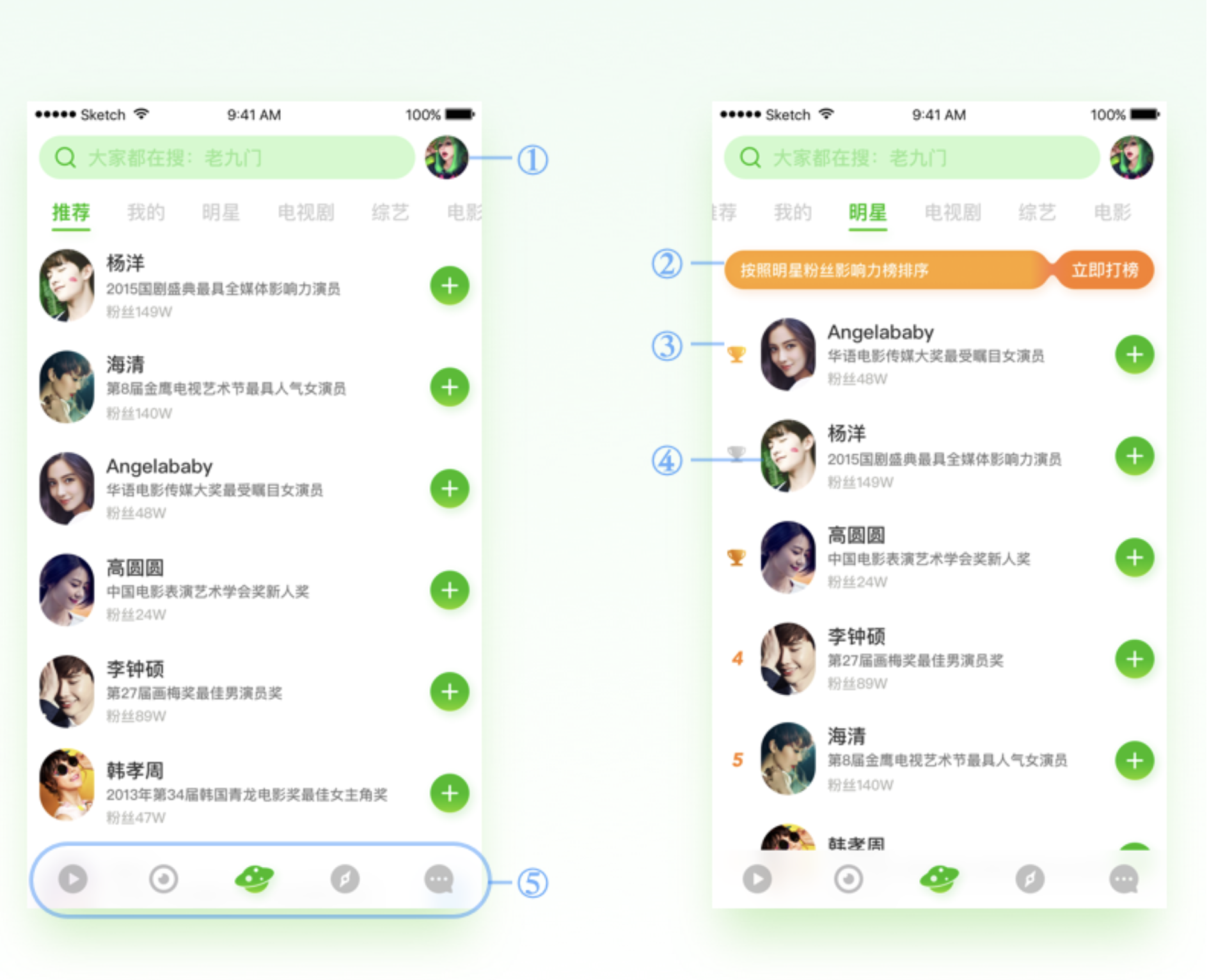 - 信息展示:明星圈簡(jiǎn)介字段保留,布局與推薦頁(yè)一致;明星標(biāo)簽頁(yè)將排序信息放列表左側(cè),不外露影響力分值等與排名相關(guān)信息,營(yíng)造榜單氛圍。