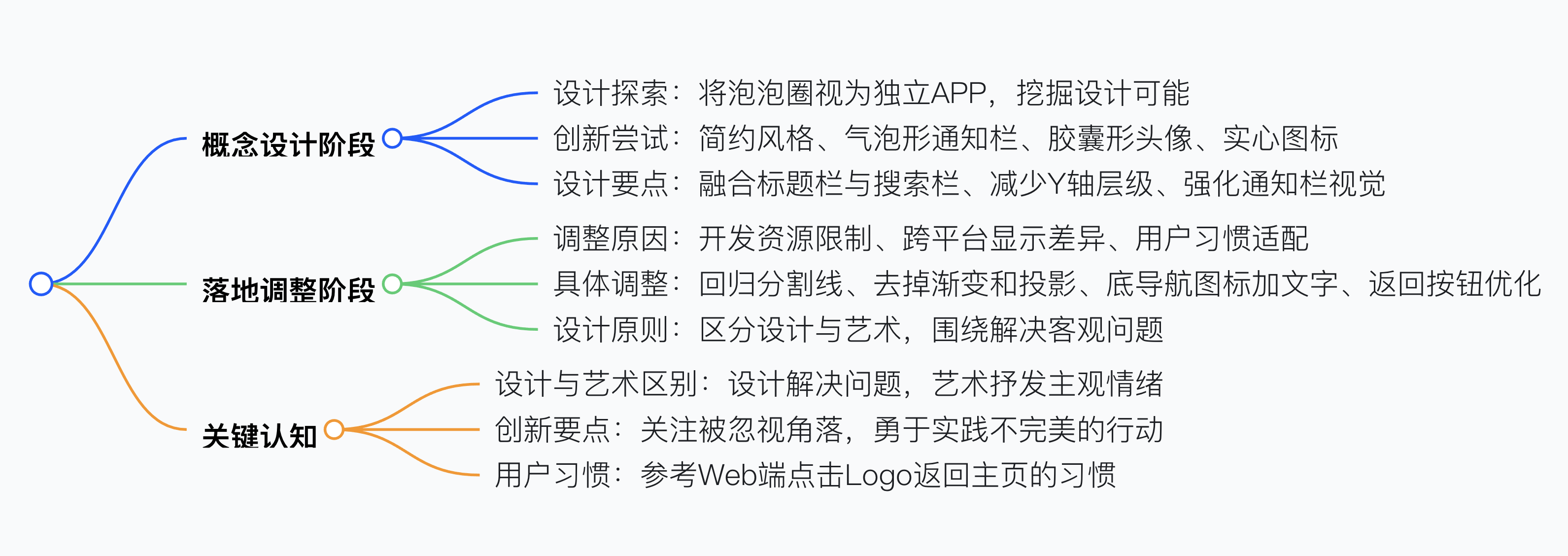 UI 設(shè)計(jì)思路應(yīng)先放飛概念探索多種可能,如將泡泡圈視為獨(dú)立 APP 進(jìn)行設(shè)計(jì),嘗試簡(jiǎn)約風(fēng)格、氣泡形通知欄、膠囊形頭像、實(shí)心圖標(biāo)等創(chuàng)新設(shè)計(jì),再結(jié)合實(shí)際落實(shí)到產(chǎn)品,比如因開(kāi)發(fā)資源和屏幕顯示限制去掉漸變和彌散投影、回歸分割線和返回按鈕,同時(shí)要明確設(shè)計(jì)與藝術(shù)的區(qū)別,設(shè)計(jì)需圍繞客觀問(wèn)題解決,概念稿后要提取可用點(diǎn)推動(dòng)落地,注重用戶(hù)習(xí)慣和跨平臺(tái)適配,像用愛(ài)奇藝 Logo 代替文字返回按鈕。