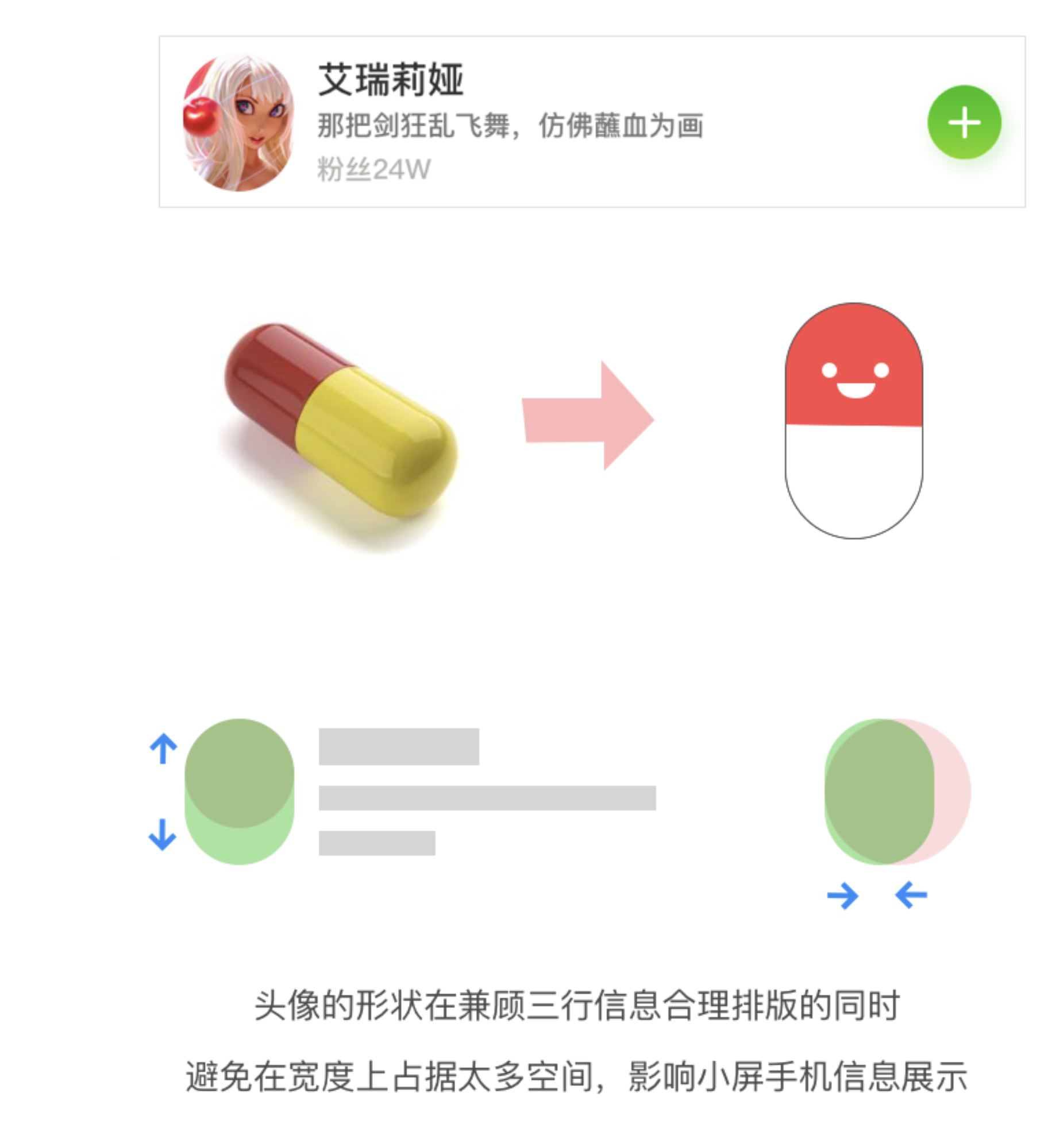 - 頭像形狀:首創(chuàng)膠囊形頭像,兼顧三行信息排版,避免小屏手機(jī)寬度占用過(guò)多空間。