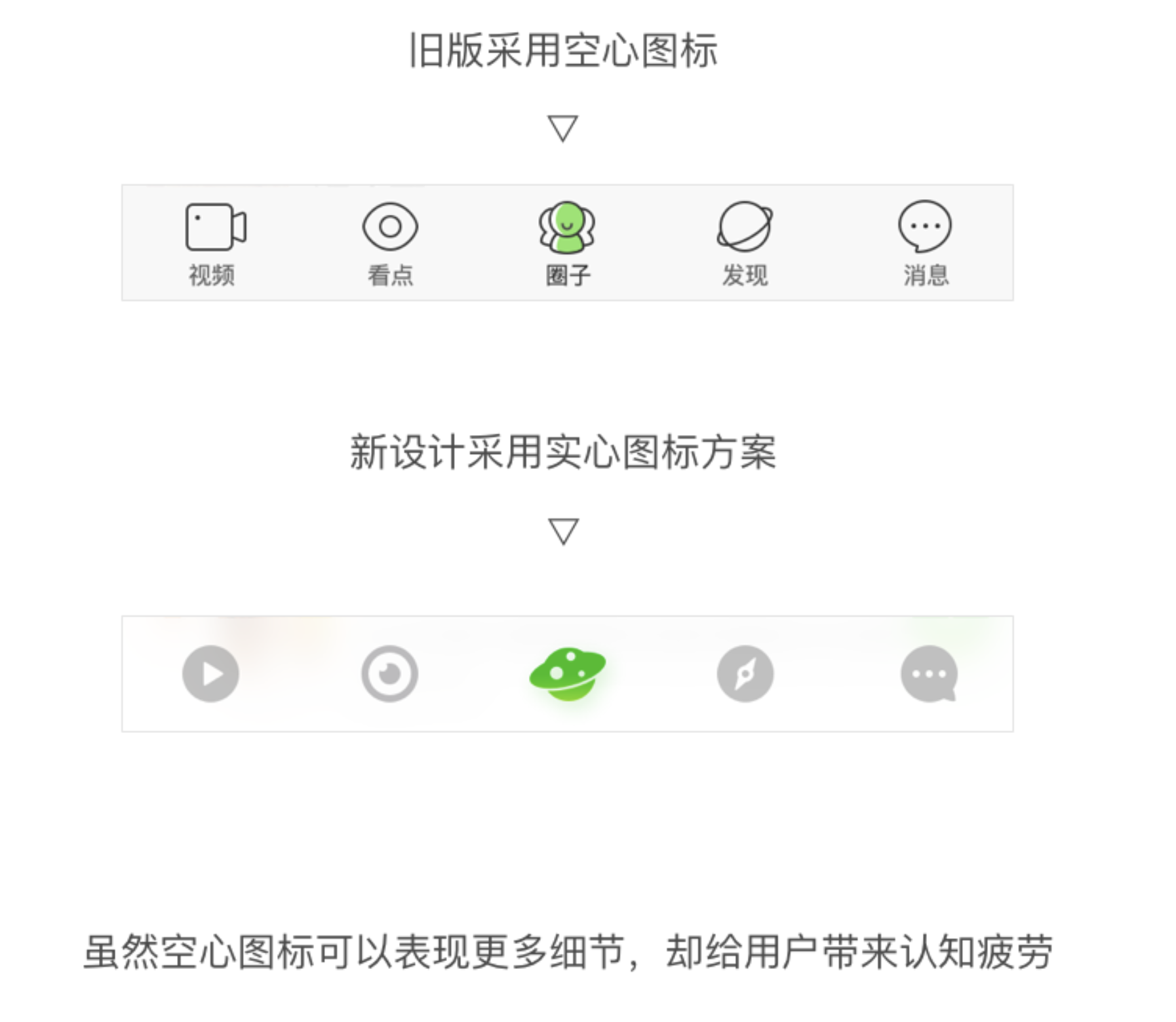 - 圖標(biāo)選擇:采用實(shí)心圖標(biāo),依據(jù)國(guó)外設(shè)計(jì)師 Aubrey Johnson 的 25000 個(gè)圖標(biāo)識(shí)別實(shí)驗(yàn),實(shí)心圖標(biāo)更符合大眾審美且識(shí)別速度更快,如手機(jī) QQ 和 Apple Music 也改用實(shí)心圖標(biāo)。