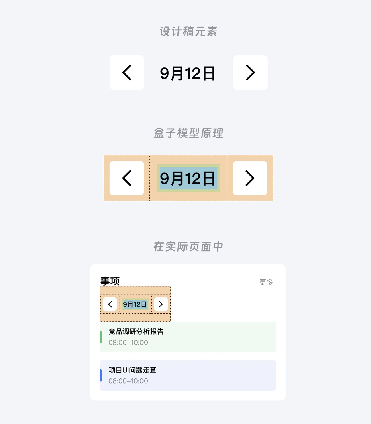 - 案例實(shí)操:以 “9 月 12 日” 的日程元素為例,其內(nèi)容(如事項(xiàng)名稱、時(shí)間)對(duì)應(yīng) content,內(nèi)容與邊框的距離為 padding,元素邊框?yàn)?border,與其他元素的間距為 margin。通過調(diào)整這些屬性,可讓元素按設(shè)計(jì)稿布局整齊排列。